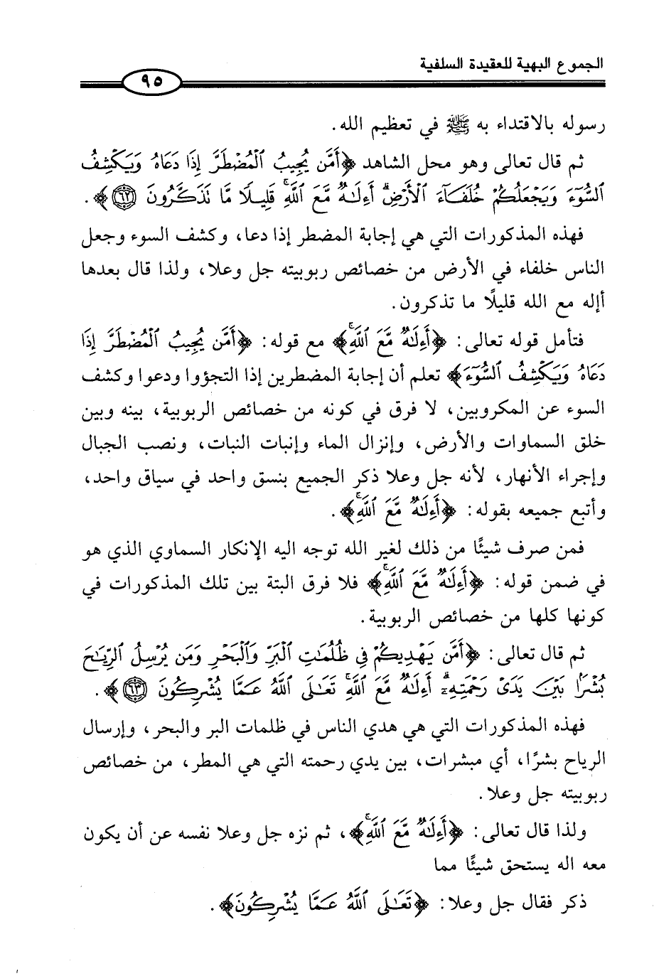 فَتَأَمَّلْ قَوْلَهَ تَعَالَى: (أَءِلاهٌ مَّعَ اللَّهِ) مَعَ قَوْلِهِ: (أَمَّن يُجِيبُ الْمُضْطَرَّ إِذَا دَعَاهُ وَيَكْشِفُ السُّو?ءَ) تعلم أَن إِجَابَة الْمُضْطَرين إِذا التجؤوا وَدَعَوْا وَكَشْفَ السُّوءِ عَنِ الْمَكْرُوبِينَ، لَا فَرْقَ فِي كَوْنِهِ مِنْ خَصَائِصِ الرُّبُوبِيَّةِ، بَيْنَهُ وَبَيْنَ خلق السَّمَاوَات وَالْأَرْض، وإنزال المَاء وإنبات النَّبَات، وَنَصْبِ الْجِبَالِ وَإِجْرَاءِ الْأَنْهَارِ، لِأَنَّهُ جَلَّ وَعَلَا ذَكَرَ الْجَمِيعَ بِنَسَقٍ وَاحِدٍ فِي سِيَاقٍ وَاحِدٍ، وأتبع جَمِيعه بقوله: (أَءِلَاهٌ مَّعَ اللَّهِ) .