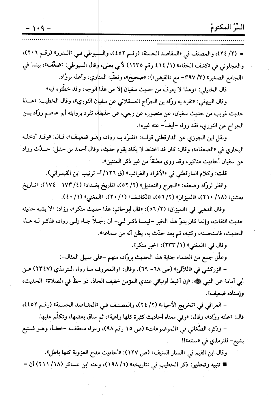 ونقل ابن الجوزي عن الدارقطني قوله: «تفرّد به رواد، وهو ضعيف» ، قال: «وقد أدخله البخاري في «الضعفاء» ، وقال: كان قد اختلط لا يكاد يقوم حديثه، وقال أحمد بن حنبل: حدَّث رواد عن سفيان أحاديث مناكير، وقد روى مطلقاً من غير ذكر المئتين» .
