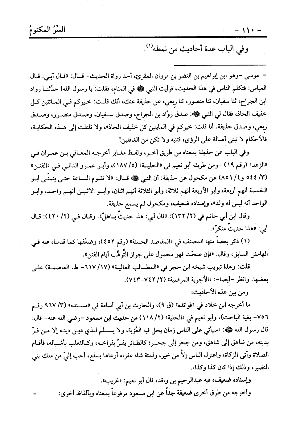 = موسى -وهو ابن إبراهيم بن النضر بن مروان المقرئ، أحد رواة الحديث- قال: «قال أبي: قال العباس: فتكلم الناس في هذا الحديث، فرأيت النبي - صلى الله عليه وسلم - في المنام، فقلت: يا رسول الله! حدّثنا رواد ابن الجراح، ثنا سفيان، ثنا منصور، ثنا رِبعي، عن حذيفة عنك، أنك قلت: خيركم في المائتين كل خفيف الحاذ، فقال لي النبي - صلى الله عليه وسلم -: صدق روَّاد بن الجراح، وصدق سفيان، وصدق منصور، وصدق رِبعي، وصدق حذيفة. أنا قلت: خيركم في المايتين كل خفيف الحاذ» ، ولا تلتفت إلى هذه الحكاية، فالأحكام لا تبنى أصالة على الرؤى، فتنبه ولا تكن من الغافلين!