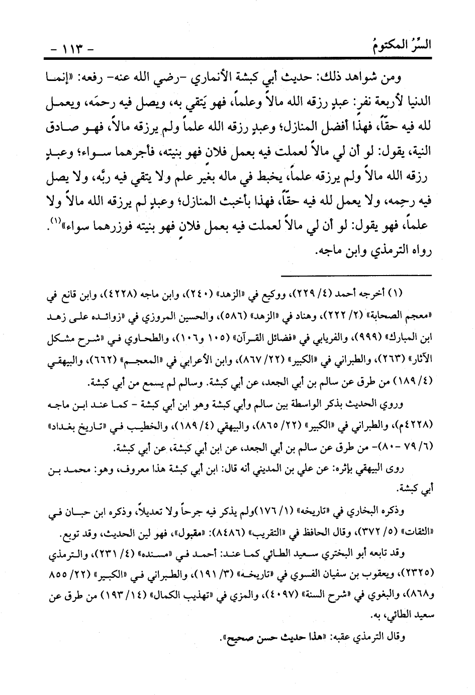 ومن شواهد ذلك: حديث أبي كبشة الأنماري -رضي الله عنه- رفعه: «إنما الدنيا لأربعة نفرٍ: عبدٍ رزقه الله مالاً وعلماً، فهو يَتقي به، ويصل فيه رحمَه، ويعمل لله فيه حقّاً، فهذا أفضل المنازل؛ وعبدٍ رزقه الله علماً ولم يرزقه مالاً، فهو صادق النية، يقول: لو أن لي مالاً لعملت فيه بعمل فلانٍ فهو بنيته، فأجرهما سواء؛ وعبدٍ رزقه الله مالاً ولم يرزقه علماً، يخبط في ماله بغير علم ولا يتقي فيه ربَّه، ولا يصل فيه رحِمه، ولا يعمل لله فيه حقّاً، فهذا بأخبث المنازل؛ وعبدٍ لم يرزقه الله مالاً ولا علماً، فهو يقول: لو أن لي مالاً لعملت فيه بعمل فلانٍ فهو بنيته فوزرهما سواء» (¬1) .