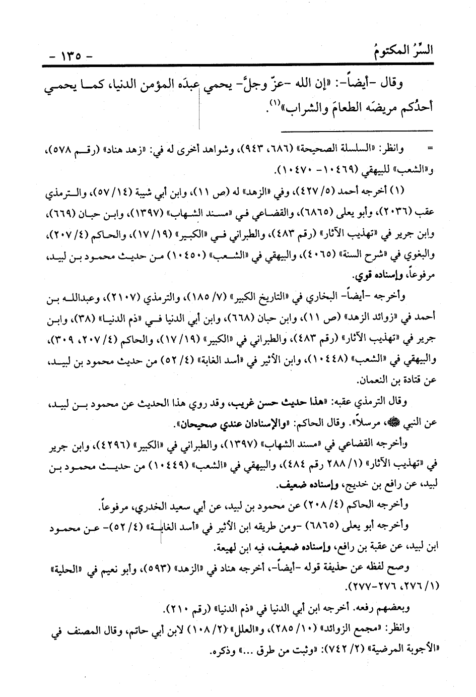 وقال -أيضاً-: «إن الله -عزّ وجلَّ- يحمي عبدَه المؤمن الدنيا، كما يحمي أحدُكم مريضَه الطعامَ والشراب» (¬1) .
