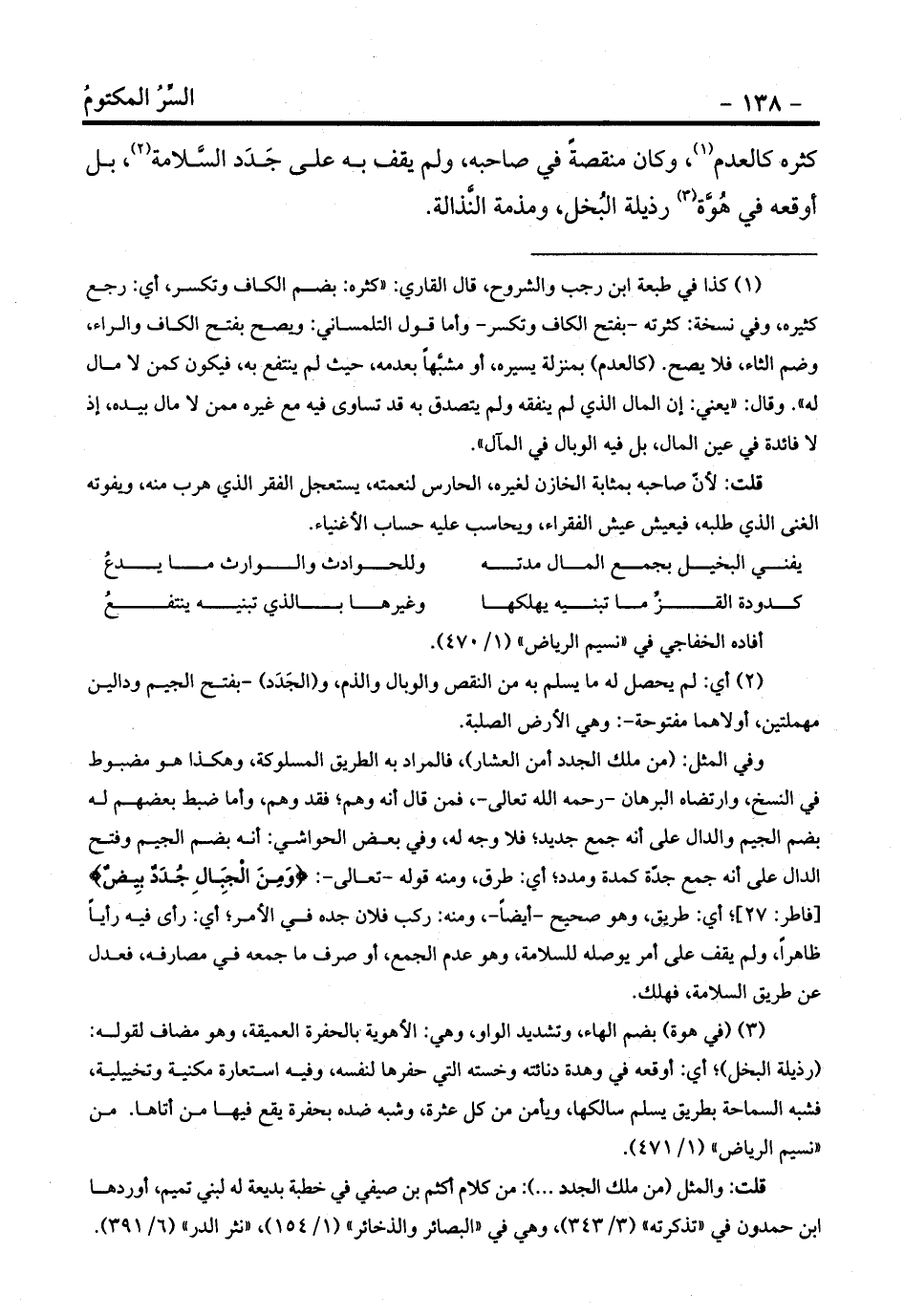 (¬1) كذا في طبعة ابن رجب والشروح، قال القاري: «كثره: بضم الكاف وتكسر، أي: رجع كثيره، وفي نسخة: كثرته -بفتح الكاف وتكسر- وأما قول التلمساني: ويصح بفتح الكاف والراء، وضم الثاء، فلا يصح. (كالعدم) بمنزلة يسيره، أو مشبَّهاً بعدمه، حيث لم ينتفع به، فيكون كمن لا مال له» . وقال: «يعني: إن المال الذي لم ينفقه ولم يتصدق به قد تساوى فيه مع غيره ممن لا مال بيده، إذ لا فائدة في عين المال، بل فيه الوبال في المآل» .