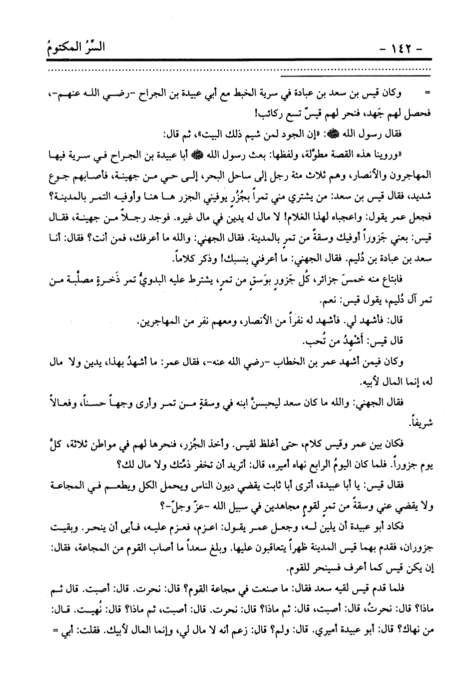 «وروينا هذه القصة مطوَّلة، ولفظها: بعث رسول الله - صلى الله عليه وسلم - أبا عبيدة بن الجراح في سرية فيها المهاجرون والأنصار، وهم ثلاث مئة رجل إلى ساحل البحر، إلى حي من جهينة، فأصابهم جوع شديد، فقال قيس بن سعد: من يشتري مني تمراً بجُزُرٍ يوفيني الجزر ها هنا وأوفيه التمر بالمدينة؟ فجعل عمر يقول: واعجباه لهذا الغلام! لا مال له يدين في مال غيره. فوجد رجلاً من جهينة، فقال قيس: بعني جَزوراً أوفيك وسقةً من تمرٍ بالمدينة. فقال الجهني: والله ما أعرفك، فمن أنت؟ فقال: أنا سعد بن عبادة بن دُليم. فقال الجهني: ما أعرفني بنسبك! وذكر كلاماً.