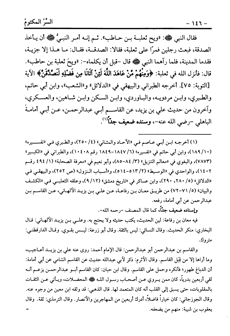 فقال النبي - صلى الله عليه وسلم -: «ويح ثعلبة بن حاطب» . ثم إنه أمر النبيُّ - صلى الله عليه وسلم - أن يأخذ الصدقة، فبعث رجلين فمرّا على ثعلبة، فقالا: الصدقة، فقال: ما هذا إلا جزية، فقدما المدينة، فلما رآهما النبي - صلى الله عليه وسلم - قال -قبل أن يكلماه-: «ويحَ ثعلبة بن حاطب» . قال: فأنزل الله في ثعلبة: {وَمِنْهُمْ مَّنْ عَاهَدَ اللَّهَ لَئِنْ آتَانَا مِن فَضْلِهِ لَنَصَّدَّقَنَّ} الآية [التوبة: 75] . أخرجه الطبراني والبيهقي في «الدلائل» و «الشعب» ، وابن أبي حاتم، والطبري، وابن مردويه، والباوردي، وابن السكن وابن شاهين، والعسكري، وآخرون من حديث علي بن يزيد، عن القاسم أبي عبد الرحمن، عن أبي أمامةَ الباهلي -رضي الله عنه-، وسنده ضعيف جدّاً (¬1) .