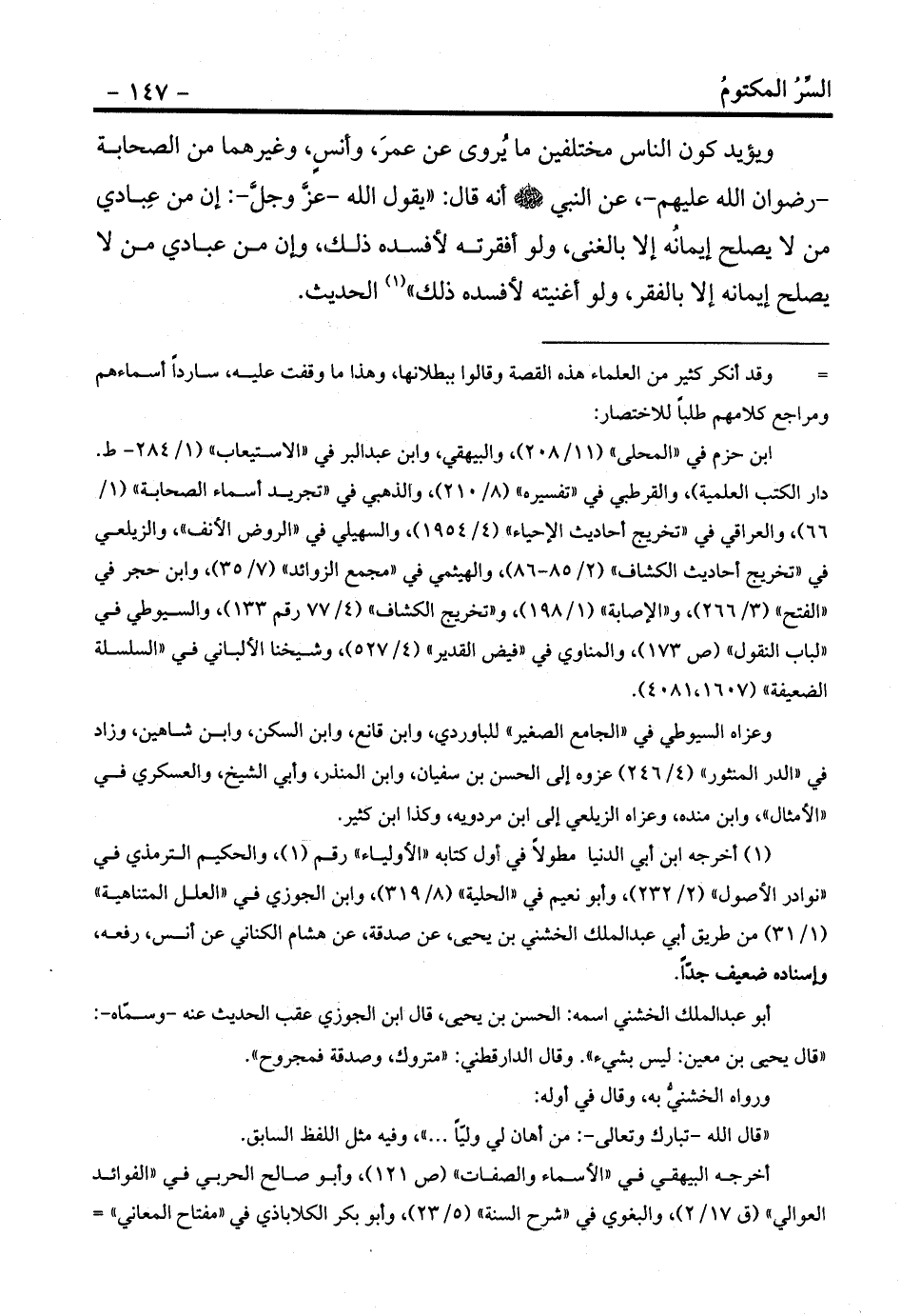 ويؤيد كون الناس مختلفين ما يُروى عن عمرَ، وأنسٍ، وغيرهما من الصحابة -رضوان الله عليهم-، عن النبي - صلى الله عليه وسلم - أنه قال: «يقول الله -عزَّ وجلَّ-: إن من عِبادي من لا يصلح إيمانُه إلا بالغنى، ولو أفقرته لأفسده ذلك، وإن من عبادي من لا يصلح إيمانه إلا بالفقر، ولو أغنيته لأفسده ذلك» (¬1)