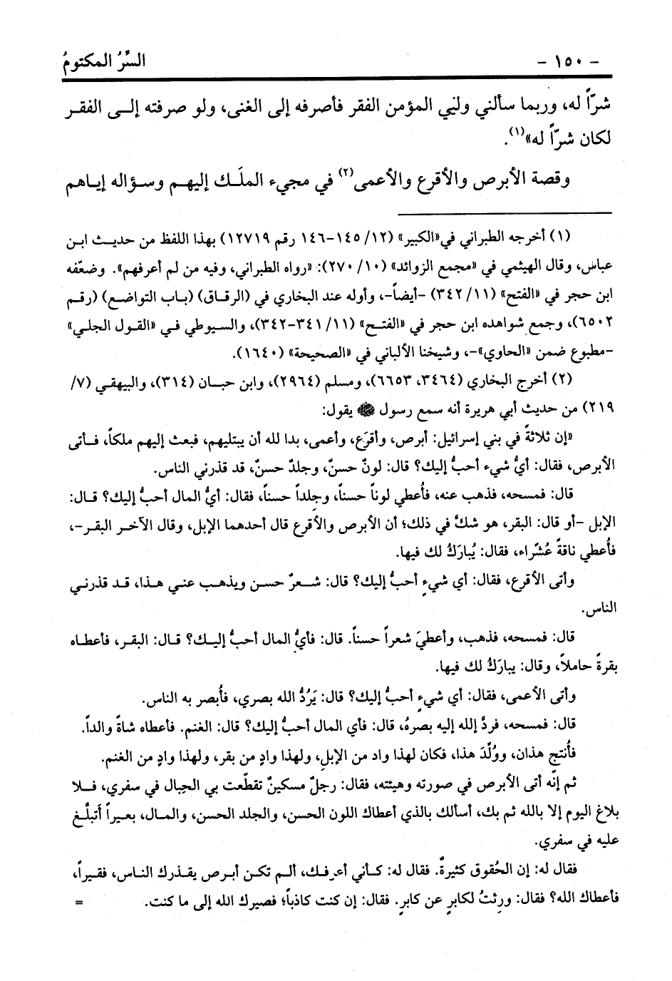 «إن ثلاثةً في بني إسرائيل: أبرص، وأقرَع، وأعمى، بدا لله أن يبتليهم، فبعث إليهم ملكاً، فأتى الأبرص، فقال: أيُّ شيء أحبُّ إليك؟ قال: لونٌ حسنٌ، وجلدٌ حسنٌ، قد قذرني الناس.