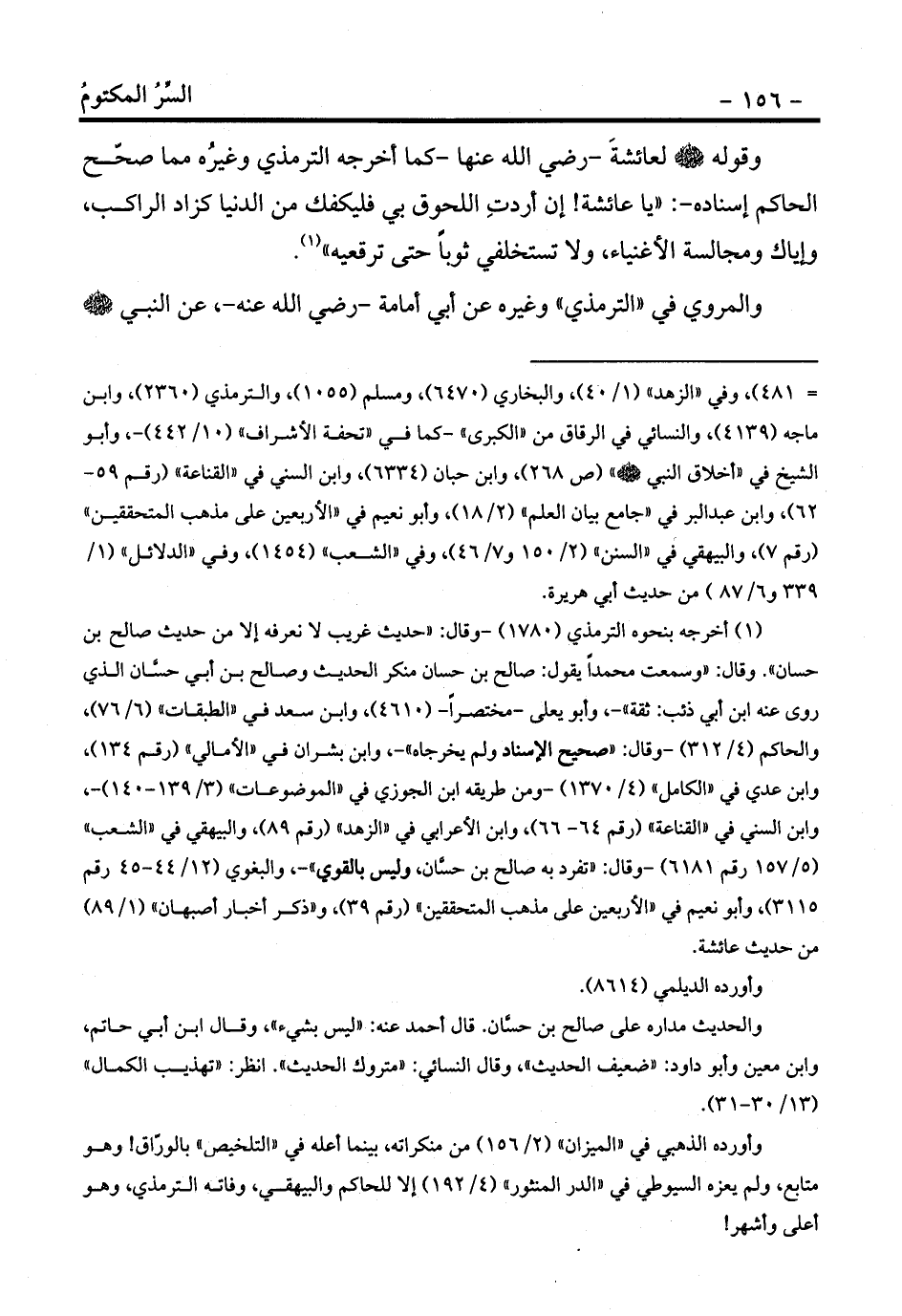 (¬1) أخرجه بنحوه الترمذي (1780) -وقال: «حديث غريب لا نعرفه إلا من حديث صالح بن حسان» . وقال: «وسمعت محمداً يقول: صالح بن حسان منكر الحديث وصالح بن أبي حسَّان الذي روى عنه ابن أبي ذئب: ثقة» -، وأبو يعلى -مختصراً- (4610) ، وابن سعد في «الطبقات» (6/76) ، والحاكم (4/312) -وقال: «صحيح الإسناد ولم يخرجاه» -، وابن بشران في «الأمالي» (رقم 134) ، وابن عدي في «الكامل» (4/1370) -ومن طريقه ابن الجوزي في «الموضوعات» (3/139-140) -، وابن السني في «القناعة» (رقم 64- 66) ، وابن الأعرابي في «الزهد» (رقم 89) ، والبيهقي في «الشعب» (5/157 رقم 6181) -وقال: «تفرد به صالح بن حسَّان، وليس بالقوي» -، والبغوي (12/44-45 رقم 3115) ، وأبو نعيم في «الأربعين على مذهب المتحققين» (رقم 39) ، و «ذكر أخبار أصبهان» (1/89) من حديث عائشة.