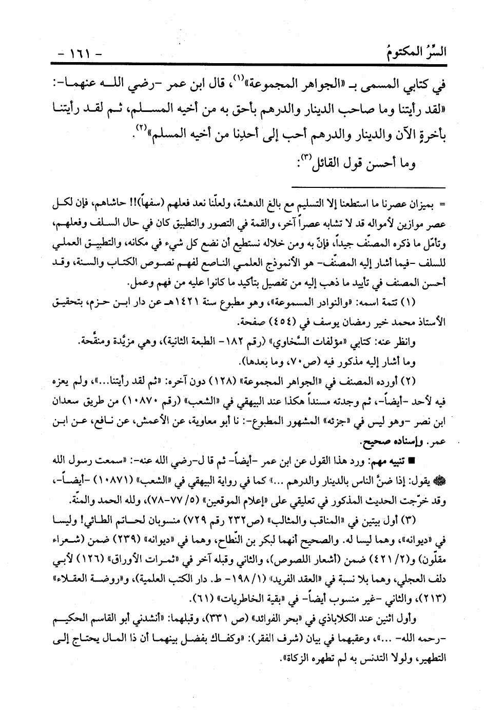 في كتابي المسمى بـ «الجواهر المجموعة» (¬1) ، قال ابن عمر -رضي الله عنهما-: «لقد رأيتنا وما صاحب الدينار والدرهم بأحق به من أخيه المسلم، ثم لقد رأيتنا بأخرةٍ الآن والدينار والدرهم أحب إلى أحدِنا من أخيه المسلم» (¬2) .