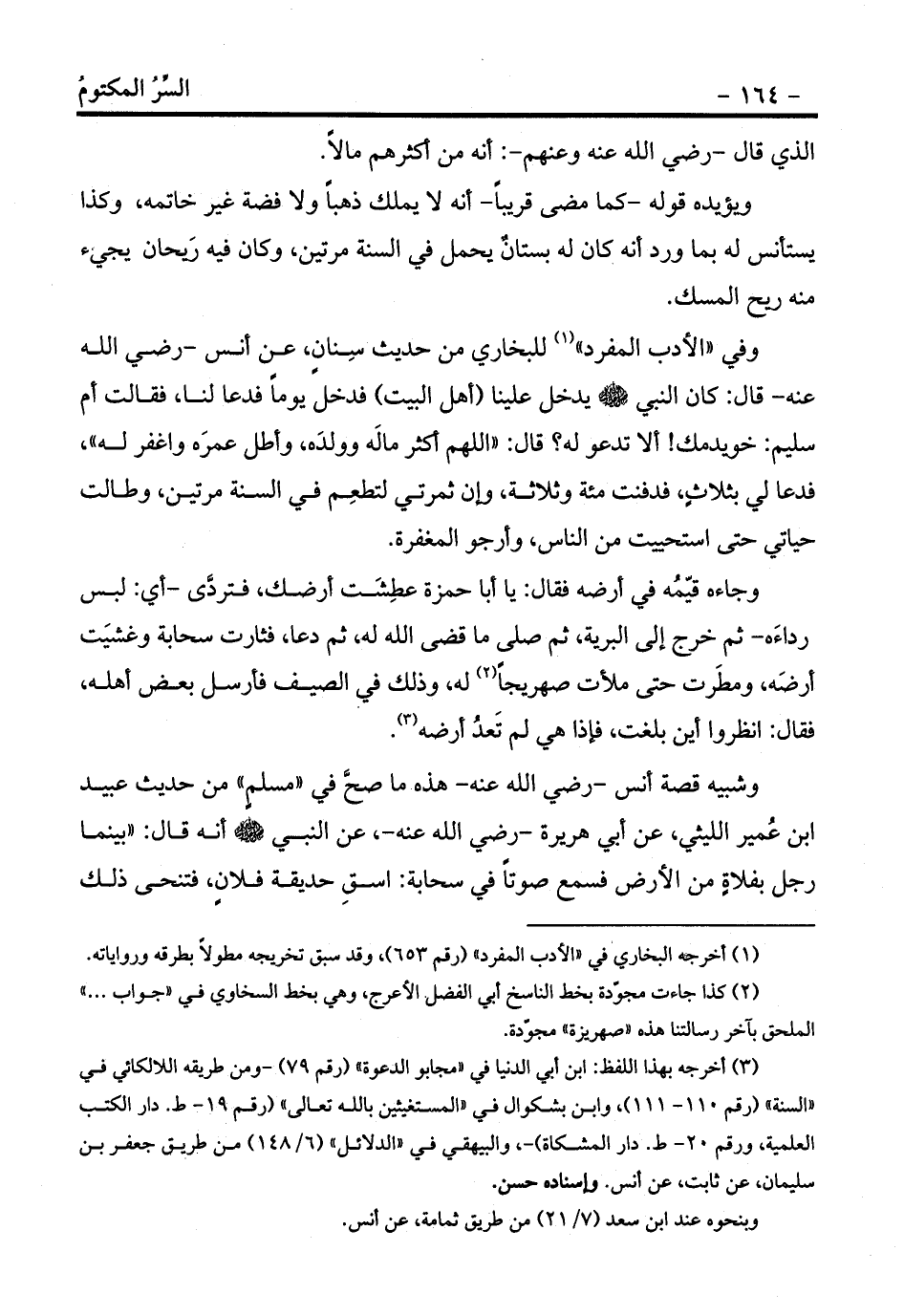ويؤيده قوله -كما مضى قريباً- أنه لا يملك ذهباً ولا فضة غير خاتمه، وكذا يستأنس له بما ورد أنه كان له بستانٌ يحمل في السنة مرتين، وكان فيه رَيحان يجيء منه ريح المسك.