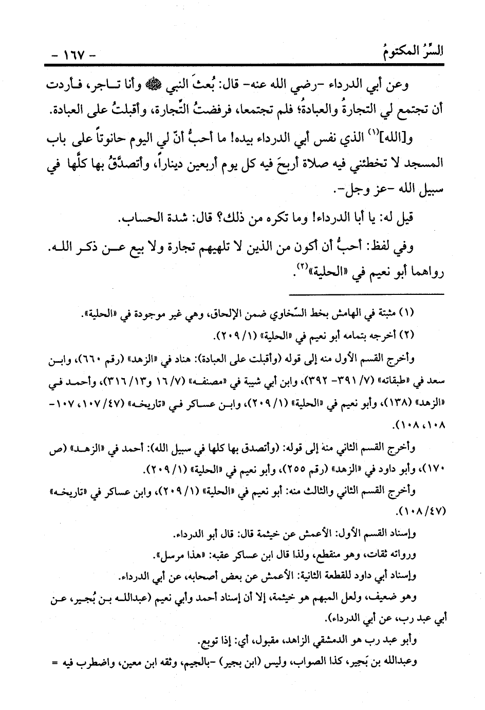 و [الله] (¬1) الذي نفس أبي الدرداء بيده! ما أحبُّ أنّ لي اليوم حانوتاً على باب المسجد لا تخطئني فيه صلاة أربحَ فيه كل يوم أربعين ديناراً، وأتصدَّقُ بها كلَّها في سبيل الله -عز وجل-.