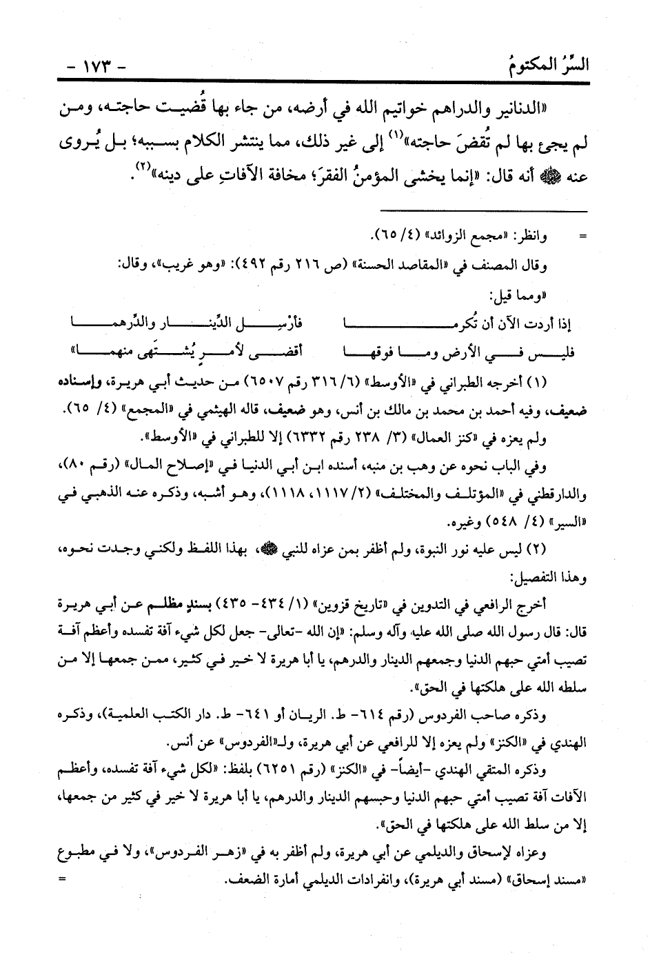 «الدنانير والدراهم خواتيم الله في أرضه، من جاء بها قُضيت حاجته، ومن لم يجئ بها لم تُقضَ حاجته» (¬1) إلى غير ذلك، مما ينتشر الكلام بسببه؛ بل يُروى عنه - صلى الله عليه وسلم - أنه قال: «إنما يخشى المؤمنُ الفقرَ؛ مخافة الآفاتِ على دينه» (¬2) .