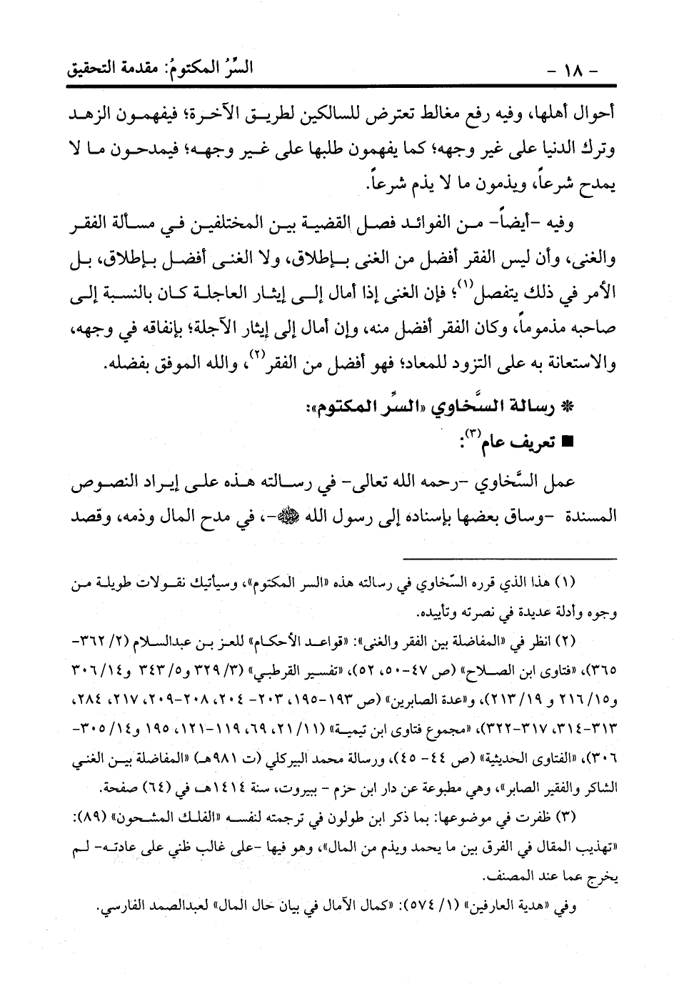 (¬2) انظر في «المفاضلة بين الفقر والغنى» : «قواعد الأحكام» للعز بن عبد السلام (2/362-365) ، «فتاوى ابن الصلاح» (ص 47-50، 52) ، «تفسير القرطبي» (3/329 و5/343 و14/306 و15/216 و 19/213) ، و «عدة الصابرين» (ص 193-195، 203- 204، 208-209، 217، 284، 313-314، 317-322) ، «مجموع فتاوى ابن تيمية» (11/21، 69، 119-121، 195 و14/305- 306) ، «الفتاوى الحديثية» (ص 44- 45) ، ورسالة محمد البيركلي (ت 981هـ) «المفاضلة بين الغني الشاكر والفقير الصابر» ، وهي مطبوعة عن دار ابن حزم - ببيروت، سنة 1414هـ، في (64) صفحة.