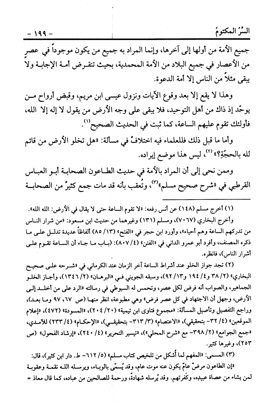 (¬2) تجد جواز الخلو عند أشراط الساعة آخر الزمان عند الكرماني في «شرحه على صحيح البخاري» (2/38 و4/194 و13/92) ، وسبقه الجويني في «البرهان» (2/1346) ، وأجاز الخلو الجماهير، والصواب أنه فرض لكل عصر، وتحمس له السيوطي في رسالته «الرد على من أخلد إلى الأرض، وجهل أن الاجتهاد في كل عصر فرض» وهي مطبوعة، انظر منها (ص 67، 97 وما بعد) ، وراجع التفصيل وتأصيل المسألة: «مجموع فتاوى ابن تيمية» (20/204) ، «المسودة» (472) ، «إعلام الموقعين» (4/32- بتحقيقي) ، «الاعتصام» (3/313- بتحقيقي) ، «الإحكام» (4/233) للآمدي، «جمع الجوامع» (2/398- مع «شرح المحلي» ) ، «تيسير التحرير» (4/240) ، «إرشاد الفحول» (ص 253) ، وغيرها كثير.