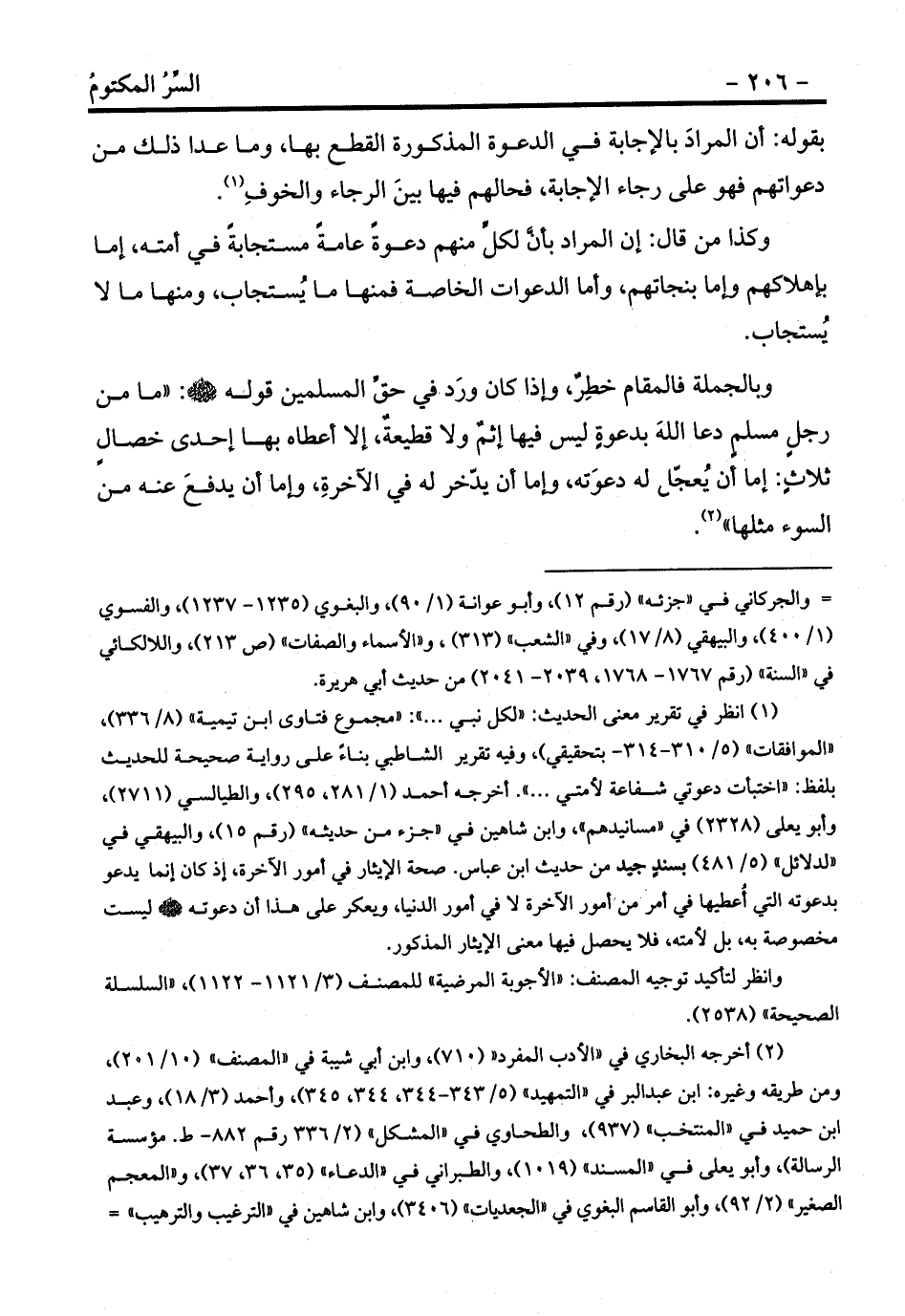 (¬1) انظر في تقرير معنى الحديث: «لكل نبي ... » : «مجموع فتاوى ابن تيمية» (8/336) ، «الموافقات» (5/310-314- بتحقيقي) ، وفيه تقرير الشاطبي بناءً على رواية صحيحة للحديث بلفظ: «اختبأت دعوتي شفاعة لأمتي ... » . أخرجه أحمد (1/281، 295) ، والطيالسي (2711) ، وأبو يعلى (2328) في «مسانيدهم» ، وابن شاهين في «جزء من حديثه» (رقم 15) ، والبيهقي في «لدلائل» (5/481) بسندٍ جيد من حديث ابن عباس. صحة الإيثار في أمور الآخرة، إذ كان إنما يدعو بدعوته التي أُعطيها في أمر من أمور الآخرة لا في أمور الدنيا، ويعكر على هذا أن دعوته - صلى الله عليه وسلم - ليست مخصوصة به، بل لأمته، فلا يحصل فيها معنى الإيثار المذكور.