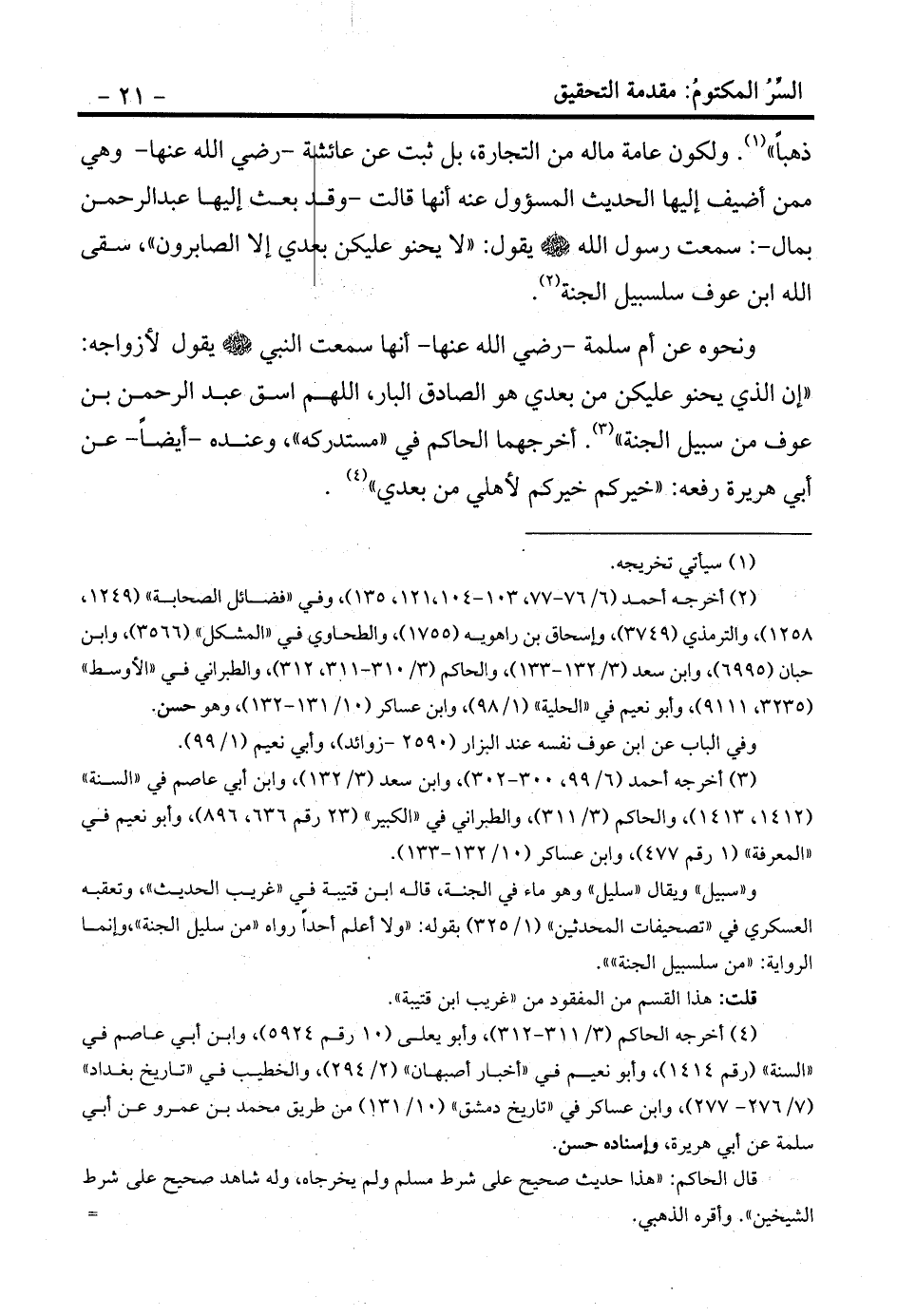 ذهباً» (¬1) . ولكون عامة ماله من التجارة، بل ثبت عن عائشة -رضي الله عنها- وهي ممن أضيف إليها الحديث المسؤول عنه أنها قالت -وقد بعث إليها عبد الرحمن بمال-: سمعت رسول الله - صلى الله عليه وسلم - يقول: «لا يحنو عليكن بعدي إلا الصابرون» ، سقى الله ابن عوف سلسبيل الجنة (¬2) .