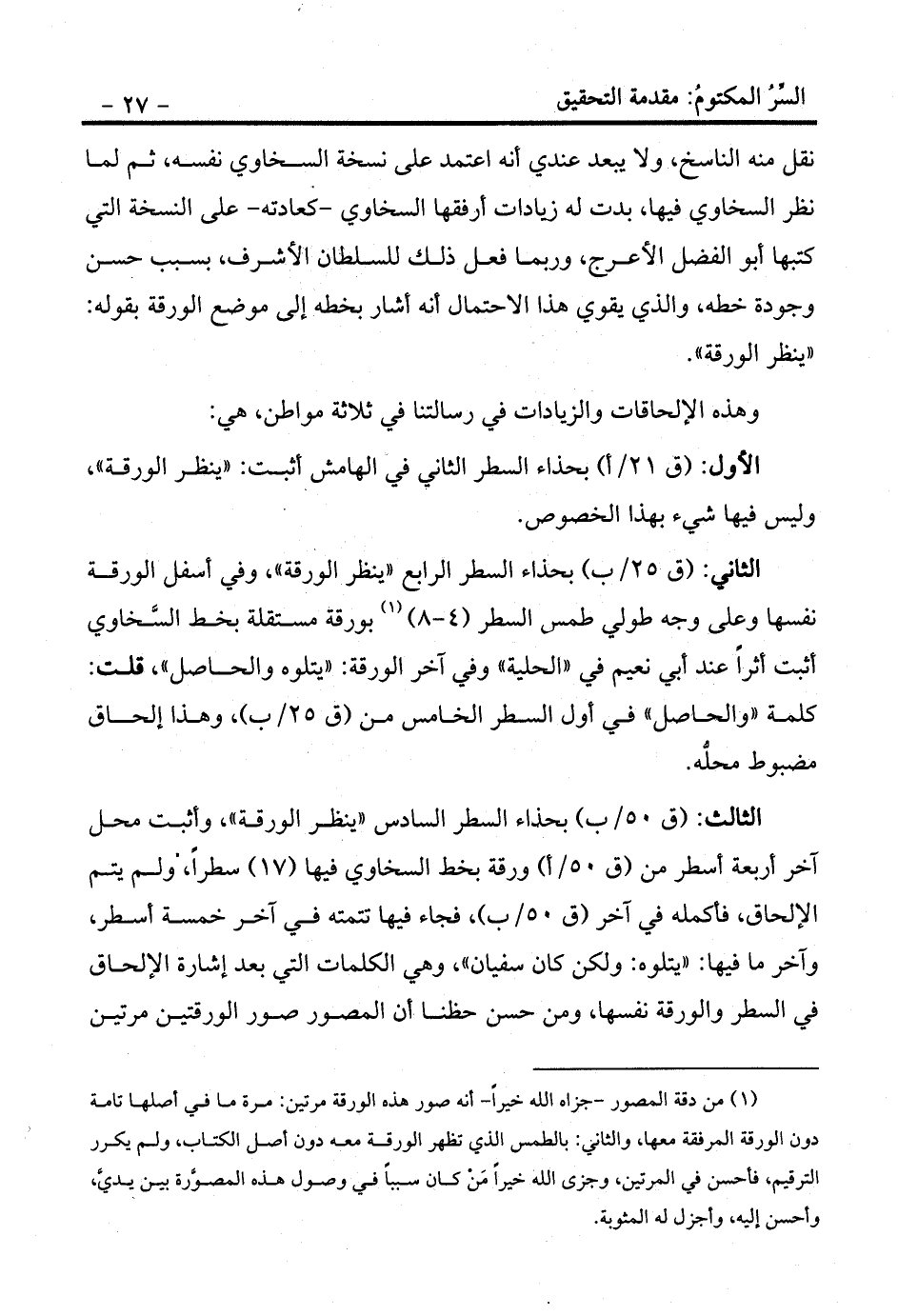 الثالث: (ق 50/ب) بحذاء السطر السادس «ينظر الورقة» ، وأثبت محل آخر أربعة أسطر من (ق 50/أ) ورقة بخط السخاوي فيها (17) سطراً، ولم يتم الإلحاق، فأكمله في آخر (ق 50/ب) ، فجاء فيها تتمته في آخر خمسة أسطر، وآخر ما فيها: «يتلوه: ولكن كان سفيان» ، وهي الكلمات التي بعد إشارة الإلحاق في السطر والورقة نفسها، ومن حسن حظنا أن المصور صور الورقتين مرتين