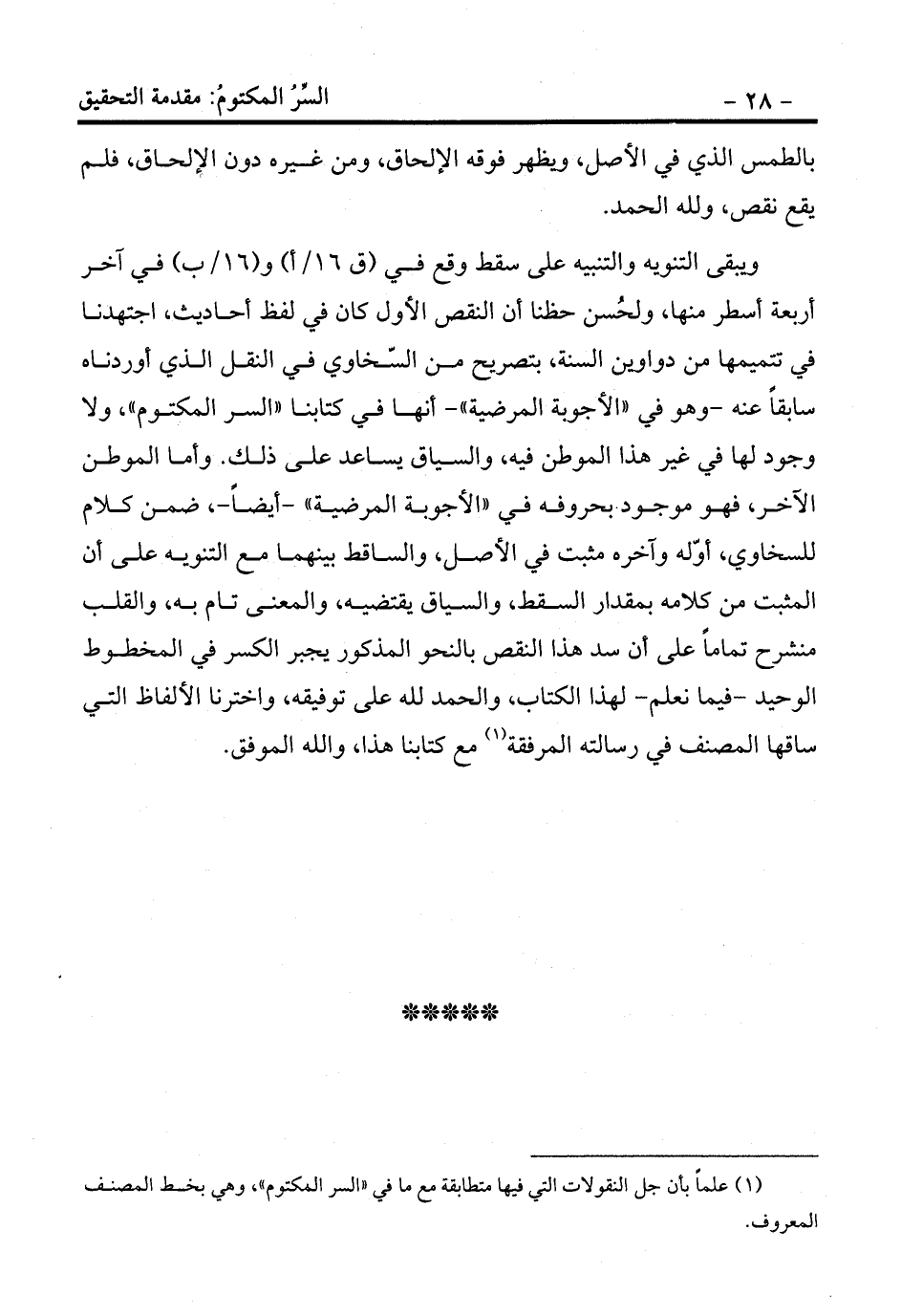 ويبقى التنويه والتنبيه على سقط وقع في (ق 16/أ) و (16/ب) في آخر أربعة أسطر منها، ولحُسن حظنا أن النقص الأول كان في لفظ أحاديث، اجتهدنا في تتميمها من دواوين السنة، بتصريح من السّخاوي في النقل الذي أوردناه سابقاً عنه -وهو في «الأجوبة المرضية» - أنها في كتابنا «السر المكتوم» ، ولا وجود لها في غير هذا الموطن فيه، والسياق يساعد على ذلك. وأما الموطن الآخر، فهو موجود بحروفه في «الأجوبة المرضية» -أيضاً-، ضمن كلام للسخاوي، أوّله وآخره مثبت في الأصل، والساقط بينهما مع التنويه على أن المثبت من كلامه بمقدار السقط، والسياق يقتضيه، والمعنى تام به، والقلب منشرح تماماً على أن سد هذا النقص بالنحو المذكور يجبر الكسر في المخطوط الوحيد -فيما نعلم- لهذا الكتاب، والحمد لله على توفيقه، واخترنا الألفاظ التي ساقها المصنف في رسالته المرفقة (¬1) مع كتابنا هذا، والله الموفق.