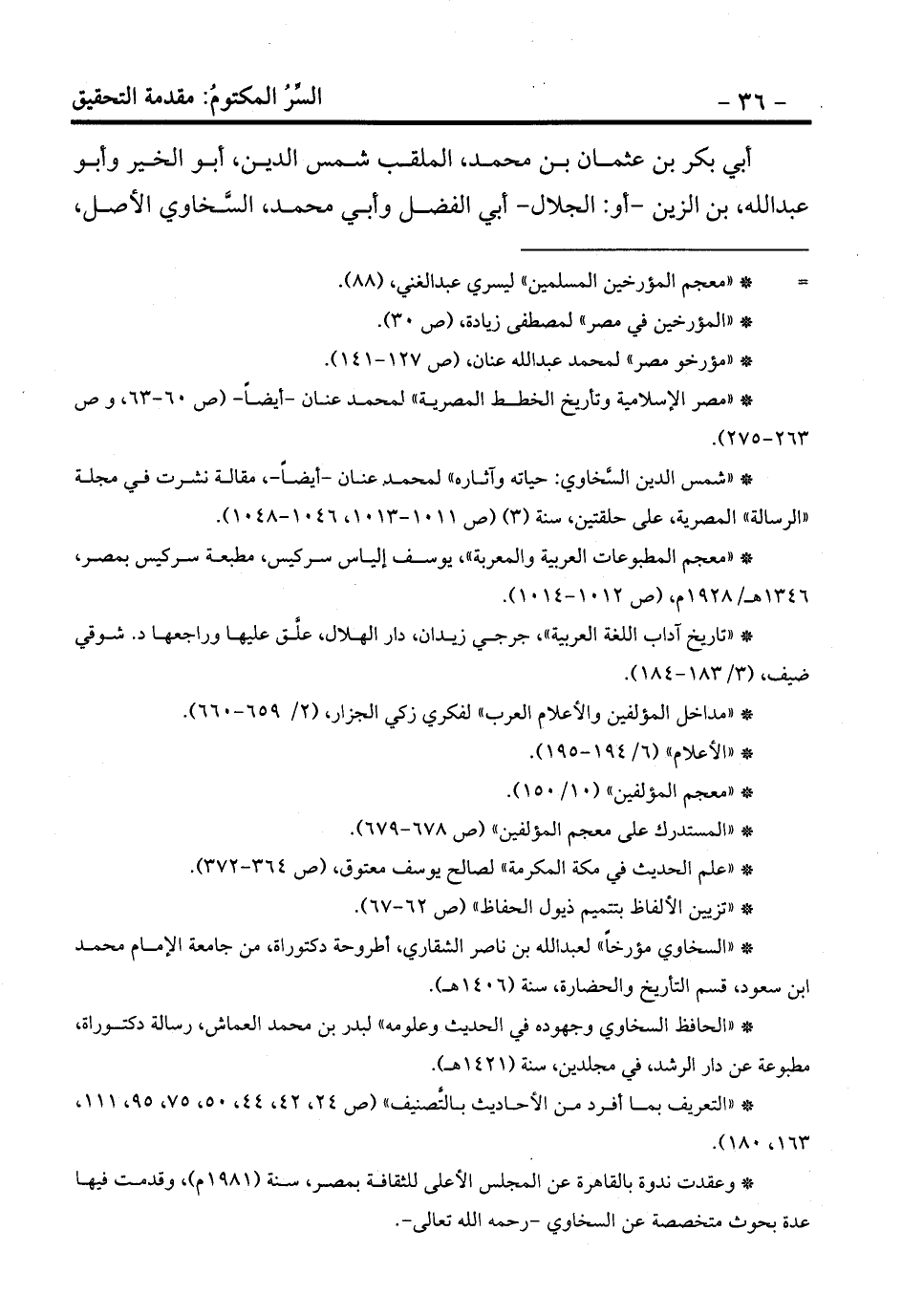 * «شمس الدين السَّخاوي: حياته وآثاره» لمحمد عنان -أيضاً-، مقالة نشرت في مجلة «الرسالة» المصرية، على حلقتين، سنة (3) (ص 1011-1013، 1046-1048) .