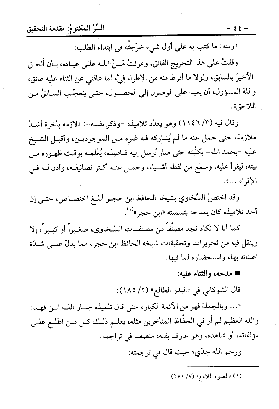 كما أنا لا نكاد نجد مصنَّفاً من مصنفات السَّخاوي، صغيراً أو كبيراً، إلا وينقل فيه من تحريرات وتحقيقات شيخه الحافظ ابن حجر، مما يدلّ على شدَّة اعتنائه بها، واستحضاره لما فيها.