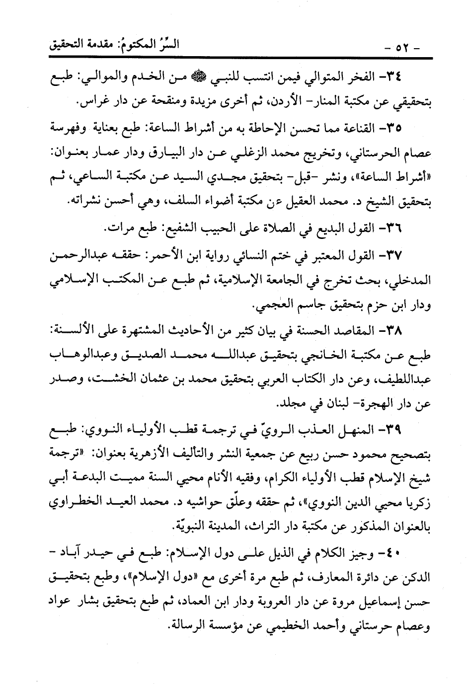 35- القناعة مما تحسن الإحاطة به من أشراط الساعة: طبع بعناية وفهرسة عصام الحرستاني، وتخريج محمد الزغلي عن دار البيارق ودار عمار بعنوان: «أشراط الساعة» ، ونشر -قبل- بتحقيق مجدي السيد عن مكتبة الساعي، ثم بتحقيق الشيخ د. محمد العقيل عن مكتبة أضواء السلف، وهي أحسن نشراته.