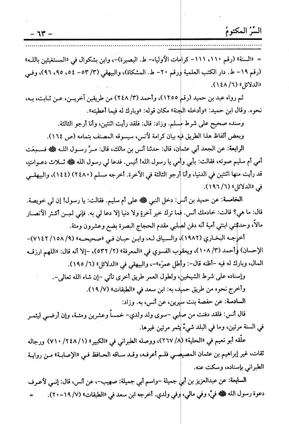 = «السنة» (رقم 110، 111- كرامات الأولياء- ط. البصيرة) -، وابن بشكوال في «المستغيثين بالله» (رقم 19- ط. دار الكتب العلمية ورقم 20- ط. المشكاة) ، والبيهقي (3/53- 54، 95، 96) ، وفي «الدلائل» (6/148) .
