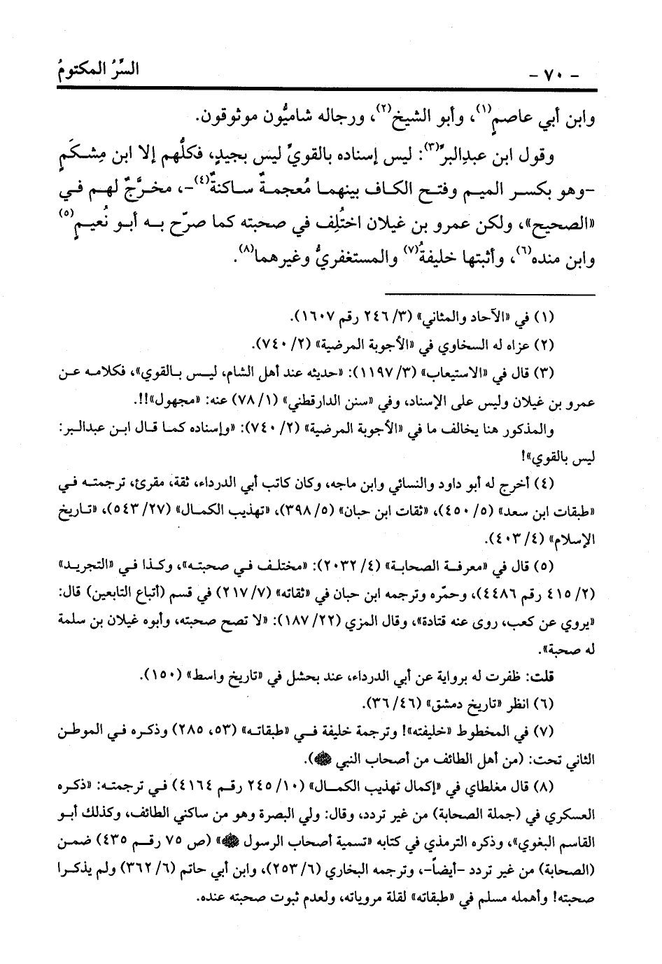 (¬8) قال مغلطاي في «إكمال تهذيب الكمال» (10/245 رقم 4164) في ترجمته: «ذكره العسكري في (جملة الصحابة) من غير تردد، وقال: ولي البصرة وهو من ساكني الطائف، وكذلك أبو القاسم البغوي» ، وذكره الترمذي في كتابه «تسمية أصحاب الرسول - صلى الله عليه وسلم -» (ص 75 رقم 435) ضمن (الصحابة) من غير تردد -أيضاً-، وترجمه البخاري (6/253) ، وابن أبي حاتم (6/362) ولم يذكرا صحبته! وأهمله مسلم في «طبقاته» لقلة مروياته، ولعدم ثبوت صحبته عنده.