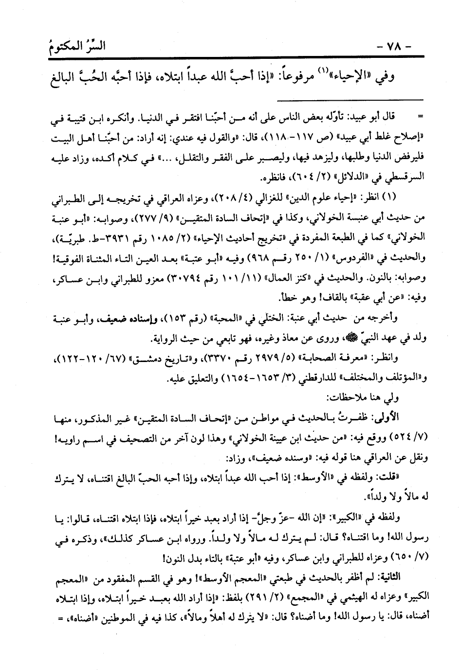 الأولى: ظفرتُ بالحديث في مواطن من «إتحاف السادة المتقين» غير المذكور، منها (7/524) ووقع فيه: «من حديث ابن عيينة الخولاني» وهذا لون آخر من التصحيف في اسم راويه! ونقل عن العراقي هنا قوله فيه: «وسنده ضعيف» ، وزاد: