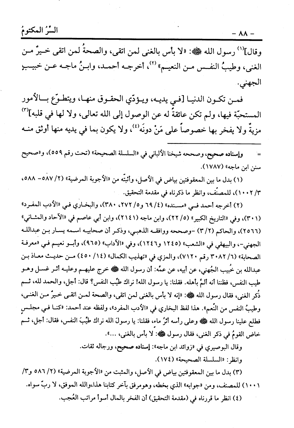 (¬2) أخرجه أحمد في «مسنده» (4/69 و5/272، 380) ، والبخاري في «الأدب المفرد» (301) ، وفي «التاريخ الكبير» (5/22) ، وابن ماجه (2141) ، وابن أبي عاصم في «الآحاد والمثاني» (2566) ، والحاكم (2/3) -وصححه ووافقه الذهبي، وذكر أن صحابيه اسمه يسار بن عبد الله الجهني-، والبيهقي في «الشعب» (1245 و1246) ، وفي «الآداب» (965) ، وأبو نعيم في «معرفة الصحابة» (6/3082 رقم 7120) ، والمزي في «تهذيب الكمال» (14/450) من حديث معاذ بن عبد الله بن خُبيب الجُهني، عن أبيه، عن عمِّه: أن رسول الله - صلى الله عليه وسلم - خرج عليهم وعليه أثر غسل وهو طيب النفس، فظننا أنه ألمَّ بأهله. فقلنا: يا رسول الله! نراك طيِّب النفس؟ قال: أجل، والحمد لله، ثم ذُكر الغنى، فقال رسول الله - صلى الله عليه وسلم -: «إنه لا بأس بالغنى لمن اتقى، والصحة لمن اتقى خيرٌ من الغنى، وطيبُ النفس من النِّعم» . هذا لفظ البخاري في «الأدب المفرد» ، ولفظه عند أحمد: «كنا في مجلسٍ فطلع علينا رسول الله - صلى الله عليه وسلم - وعلى رأسه أثرُ ماءٍ، فقلنا: يا رسولَ الله نراك طيِّبَ النفس، فقال: أجل، ثم خاض القومُ في ذكر الغنى، فقال رسول - صلى الله عليه وسلم -: لا بأس بالغنى، ... » .