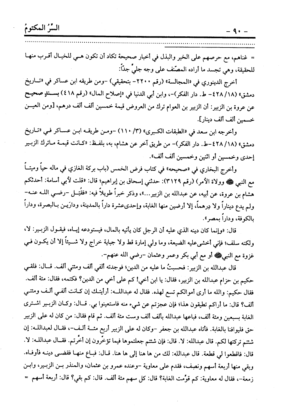 أخرج الدينوري في «المجالسة» (رقم 2200- بتحقيقي) -ومن طريقه ابن عساكر في «تاريخ دمشق» (18/428- ط. دار الفكر) -، وابن أبي الدنيا في «إصلاح المال» (رقم 418) بسندٍ صحيح عن عروة بن الزبير: أن الزبير بن العوام ترك من العروض قيمة خمسين ألف ألف درهم، [ومن العين خسمين ألف ألف دينار] .