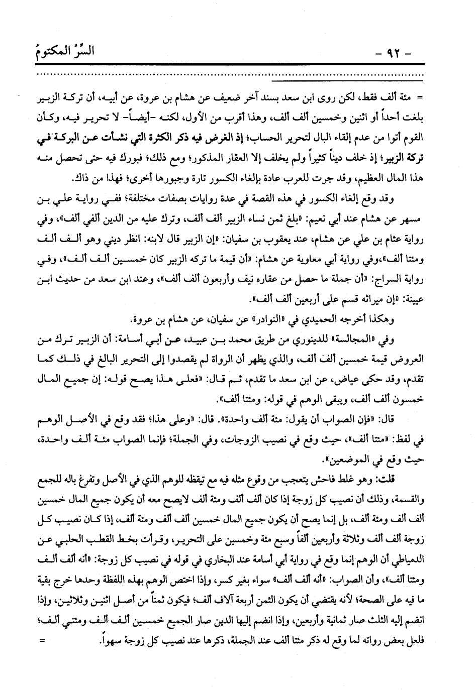 = مئة ألف فقط، لكن روى ابن سعد بسند آخر ضعيف عن هشام بن عروة، عن أبيه، أن تركة الزبير بلغت أحداً أو اثنين وخمسين ألف ألف، وهذا أقرب من الأول، لكنه -أيضاً- لا تحرير فيه، وكأن القوم أتوا من عدم إلقاء البال لتحرير الحساب؛ إذ الغرض فيه ذكر الكثرة التي نشأت عن البركة في تركة الزبير؛ إذ خلف ديناً كثيراً ولم يخلف إلا العقار المذكور؛ ومع ذلك؛ فبورك فيه حتى تحصل منه هذا المال العظيم، وقد جرت للعرب عادة بإلغاء الكسور تارة وجبورها أخرى؛ فهذا من ذاك.