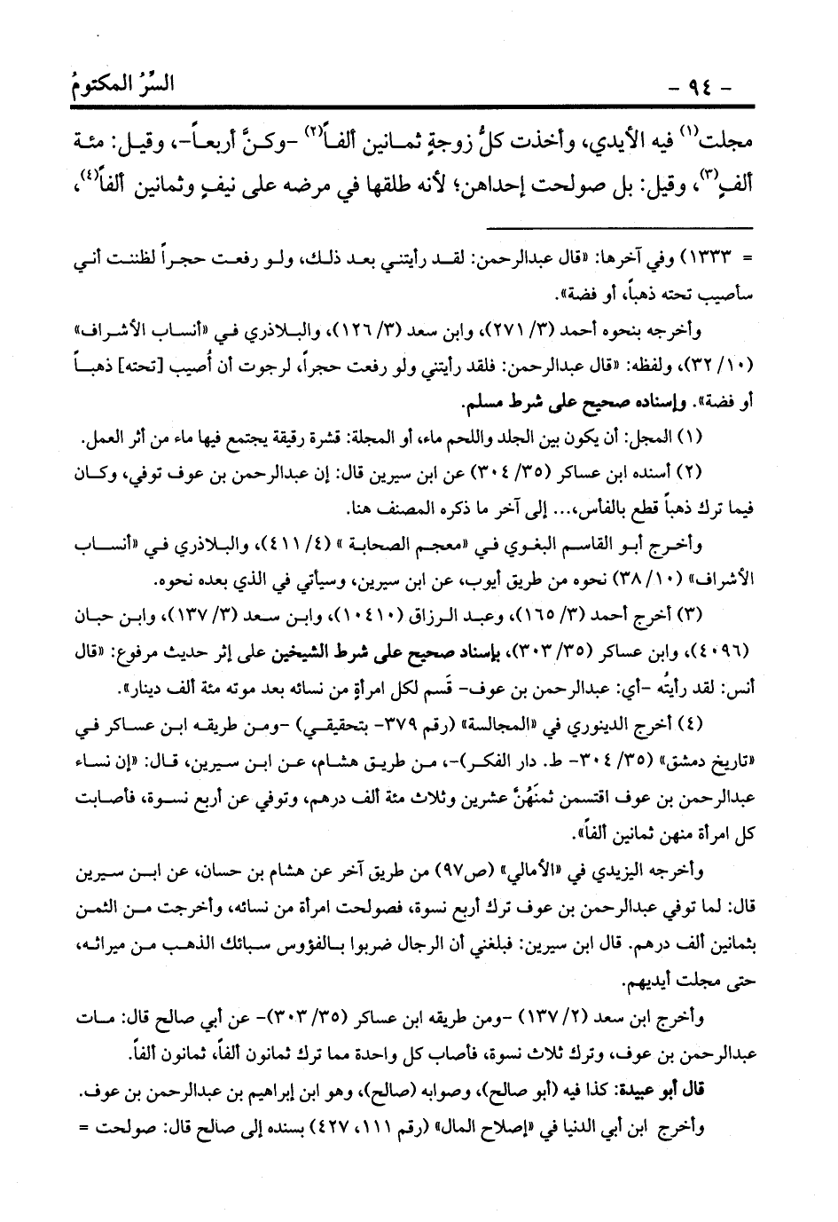 (¬4) أخرج الدينوري في «المجالسة» (رقم 379- بتحقيقي) -ومن طريقه ابن عساكر في «تاريخ دمشق» (35/304- ط. دار الفكر) -، من طريق هشام، عن ابن سيرين، قال: «إن نساء عبد الرحمن بن عوف اقتسمن ثمنَهُنَّ عشرين وثلاث مئة ألف درهم، وتوفي عن أربع نسوة، فأصابت كل امرأة منهن ثمانين ألفاً» .