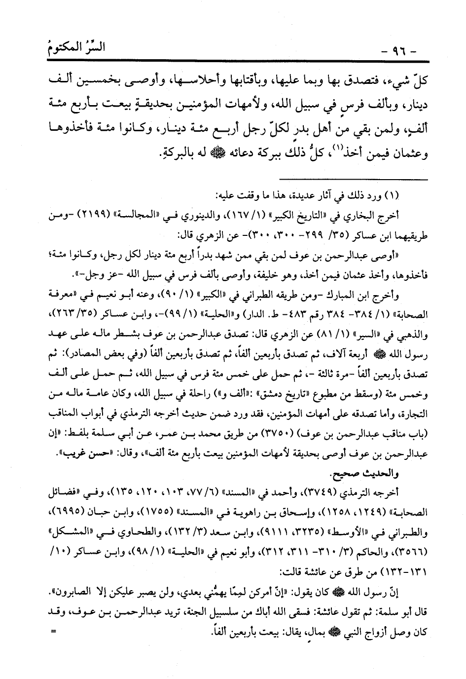 وأخرج ابن المبارك -ومن طريقه الطبراني في «الكبير» (1/90) ، وعنه أبو نعيم في «معرفة الصحابة» (1/384- 384 رقم 483- ط. الدار) و «الحلية» (1/99) -، وابن عساكر (35/263) ، والذهبي في «السير» (1/81) عن الزهري قال: تصدق عبد الرحمن بن عوف بشطر ماله على عهد رسول الله - صلى الله عليه وسلم - أربعة آلاف، ثم تصدق بأربعين ألفاً، ثم تصدق بأربعين ألفاً (وفي بعض المصادر) : ثم تصدق بأربعين ألفاً -مرة ثالثة -، ثم حمل على خمس مئة فرس في سبيل الله، ثم حمل على ألف وخمس مئة (وسقط من مطبوع «تاريخ دمشق» : «ألف و» ) راحلة في سبيل الله، وكان عامة ماله من التجارة، وأما تصدقه على أمهات المؤمنين، فقد ورد ضمن حديث أخرجه الترمذي في أبواب المناقب (باب مناقب عبد الرحمن بن عوف) (3750) من طريق محمد بن عمر، عن أبي سلمة بلفط: «إن عبد الرحمن بن عوف أوصى بحديقة لأمهات المؤمنين بيعت بأربع مئة ألف» ، وقال: «حسن غريب» .