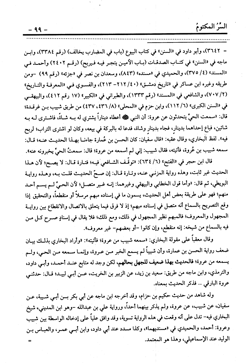 = 3642) ، وأبو داود في «السنن» في كتاب البيوع (باب في المضارب يخالف) (رقم 3384) ، وابن ماجه في «السنن» في كتاب الصدقات (باب الأمين يتجر فيه فيربح) (رقم 2402) وأحمد في «المسند» (4/375) ، والحميدي في «مسنده» (843) ، وسعدان بن نصر في «جزئه» (رقم 99) -ومن طريقه وغيره ابن عساكر في «تاريخ دمشق» (40/212- 213) ، والفسوي في «المعرفة والتاريخ» (2/707) ، والشافعي في «المسند» (رقم 1333) ، والطبراني في «الكبير» (17 رقم 412) ، والبيهقي في «السنن الكبرى» (6/112) ، وابن حزم في «المحلى» (8/436، 437) من طريق شبيب بن غرقدة؛ قال: «سمعت الحيَّ يتحدثون عن عروة: أن النبي - صلى الله عليه وسلم - أعطاه ديناراً يشتري له به شاةً، فاشترى له به شاتين، فباع إحداهما بدينارٍ، فجاء بدينارٍ وشاة، فدعا له بالبركة في بيعه، وكان لو اشترى التراب؛ لربح فيه» . لفظ البخاري، وقال عقبه: «قال سفيان: كان الحسن بن عُمارة جاءنا بهذا الحديث عنه؛ قال: سمعه شبيب بن عُروة، فأتيته، فقال شبيب: إني لم أسمعه من عروة؛ قال: سمعتُ الحيَّ يخبرونه عنه» .