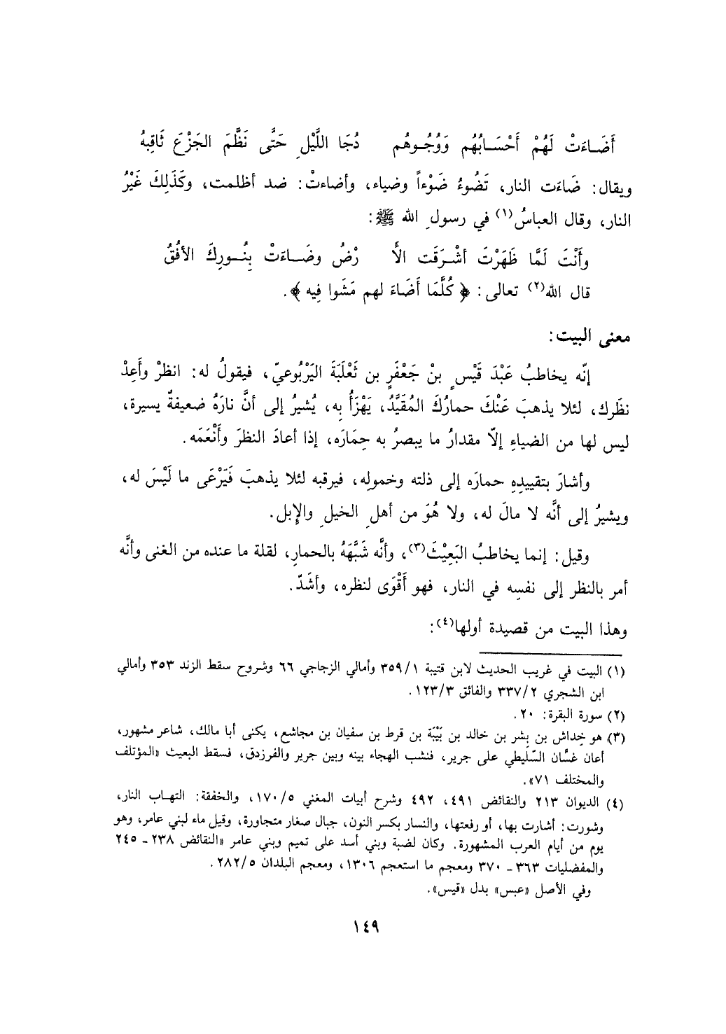 إنه يخاطب عبد قيس بن جعفر بن ثعلبة اليربوعي، فيقول له: انظر وأعد نظرك، لئلا يذهب عنك حمارك المقيد، يهزأ به، يشير إلى أن ناره ضعيفة يسيرة، ليس لها م الضياء إلا مقدار ما يبصر به حماره، إذا أعاد النظر وأنعمه.
