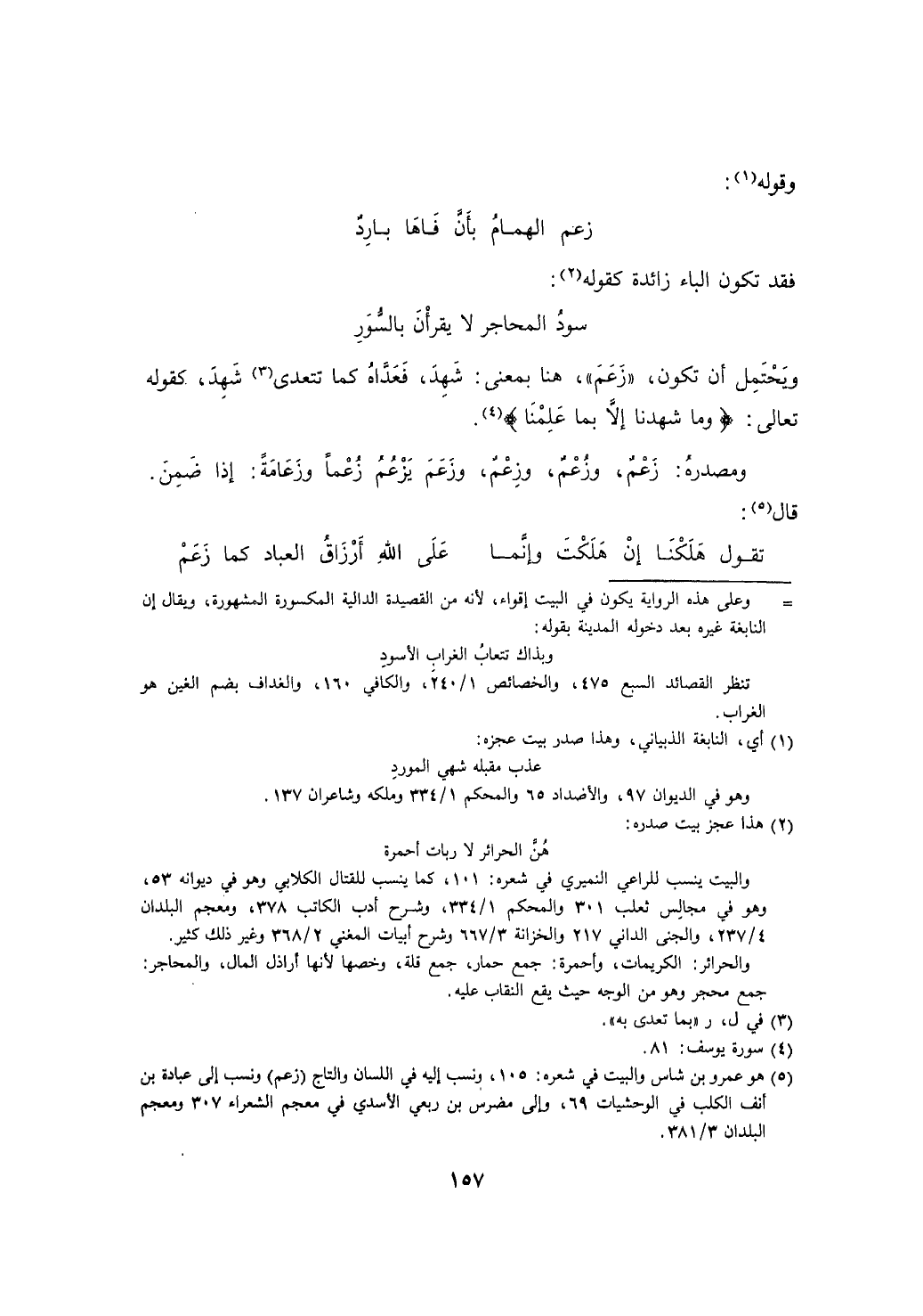 ويحتمل أن تكون، "زعم"، هنا بمعنى: شهد، فعداه كما تتعدى شهد، كقوله تعالى: (وما شهدنا إلا بما علمنا) .