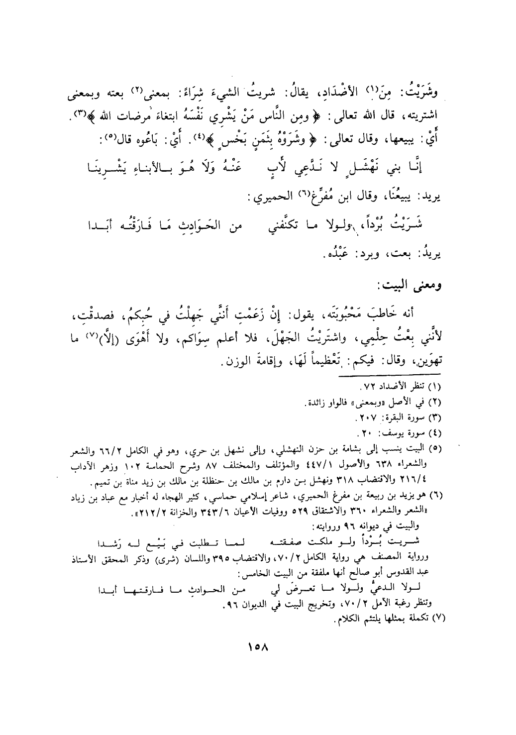 وشريت: من الأضداد، يقال: سريت الشيء شراء: بمعنى بعته وبمعنى اشتريته، قال الله تعالى: (ومن الناس من يشري نفسه ابتغاء مرضات الله) .