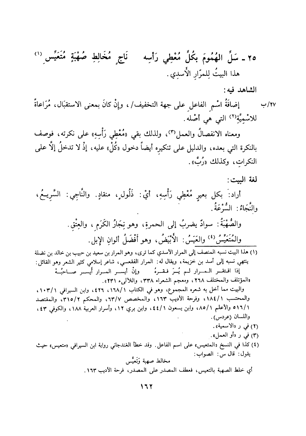 سلَّ الهمومَ بكلِّ معطي رأسه ... ناجٍ مخالط صهبةٍ متعيِّسِ