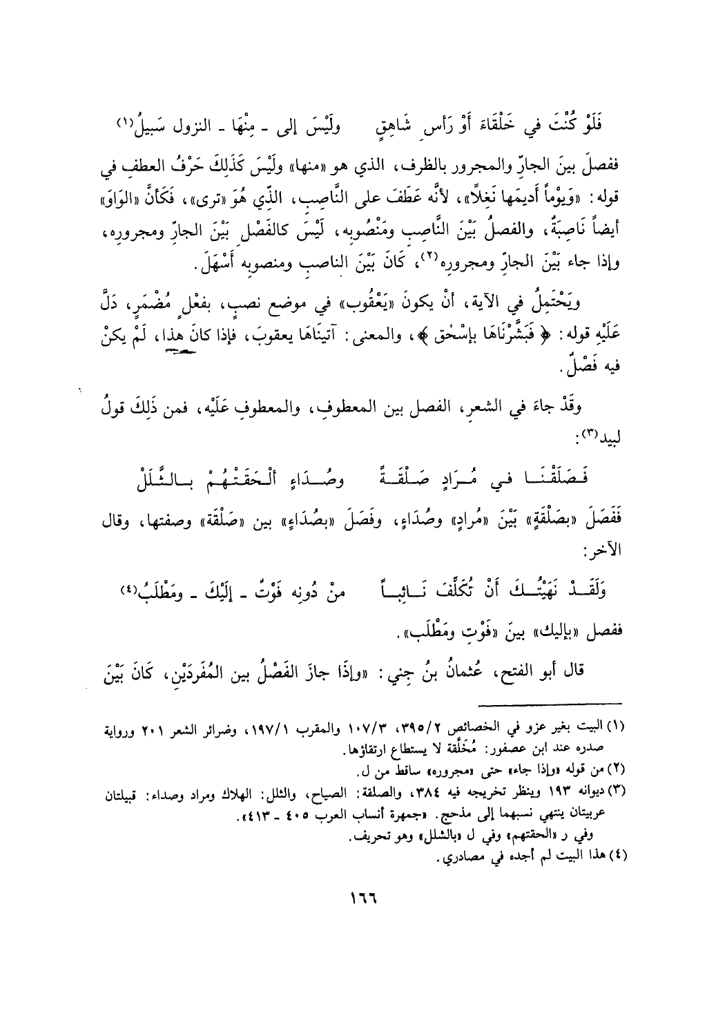 قال أبو الفتح، عثمان بن جني: "وإذا جاز الفصل بين المفردين، كان بين