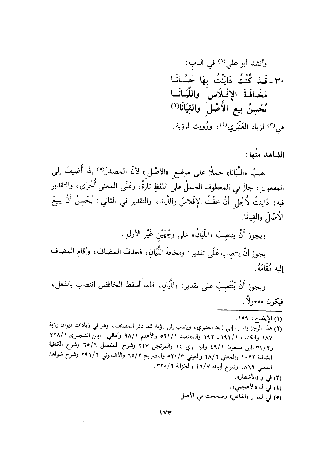 نصب "الليانا" حملاً على موضع "الأصل" لأن المصدر إذا أضيف إلى المفعول، جاز في المعطوف الحمل على اللفظ تارة، وعلى المعنى أخرى، والتقدير فيه: داينت لأجل أن خفت الإفلاس والليانا، والتقدير في الثاني: يحسن أن يبيع الأصل والقيانا.