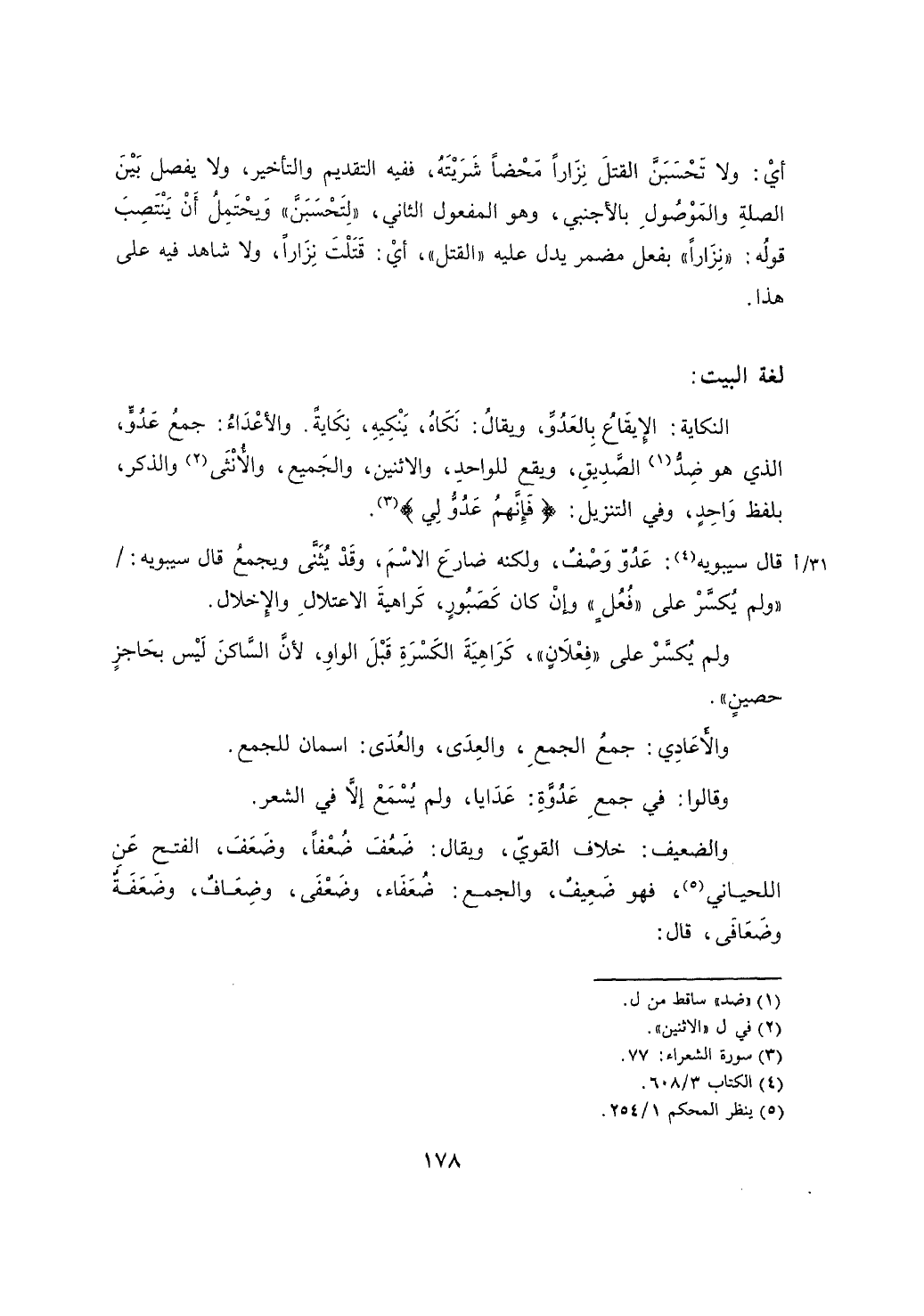 أي: ولا تحسبن القتل نزاراً محضاً شريته، ففيه التقديم والتأخير، ولا يفصل بين الصلة والموصول بالأجنبي، وهو المفعول الثاني، "لتحسبن" ويحتمل أن ينتصب قوله: "نزاراً" بفعل مضمر يدل عليه "القتل"، أي قتلت نزاراً، ولا شاهد فيه على هذا.