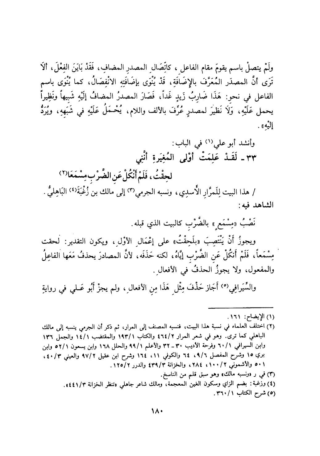 ولم يتصل باسم يقوم مقام الفاعل، كاتصال المصدر المضاف، فقد باين الفعل، ألا ترى أن المصدر المعرف بالإضافة، قد ينوي بإضافته الانفصال، كما ينوي باسم الفاعل في نحو: هذا ضارب زيد غداً، فصار المصدر المضاف إليه شبيهاً ونظيراً يحمل عليه، ولا نظر لمصدر عرف بالألف واللام، يحمل عليه في شبهه، ويرد إليه" وأنشد أبو علي في الباب: