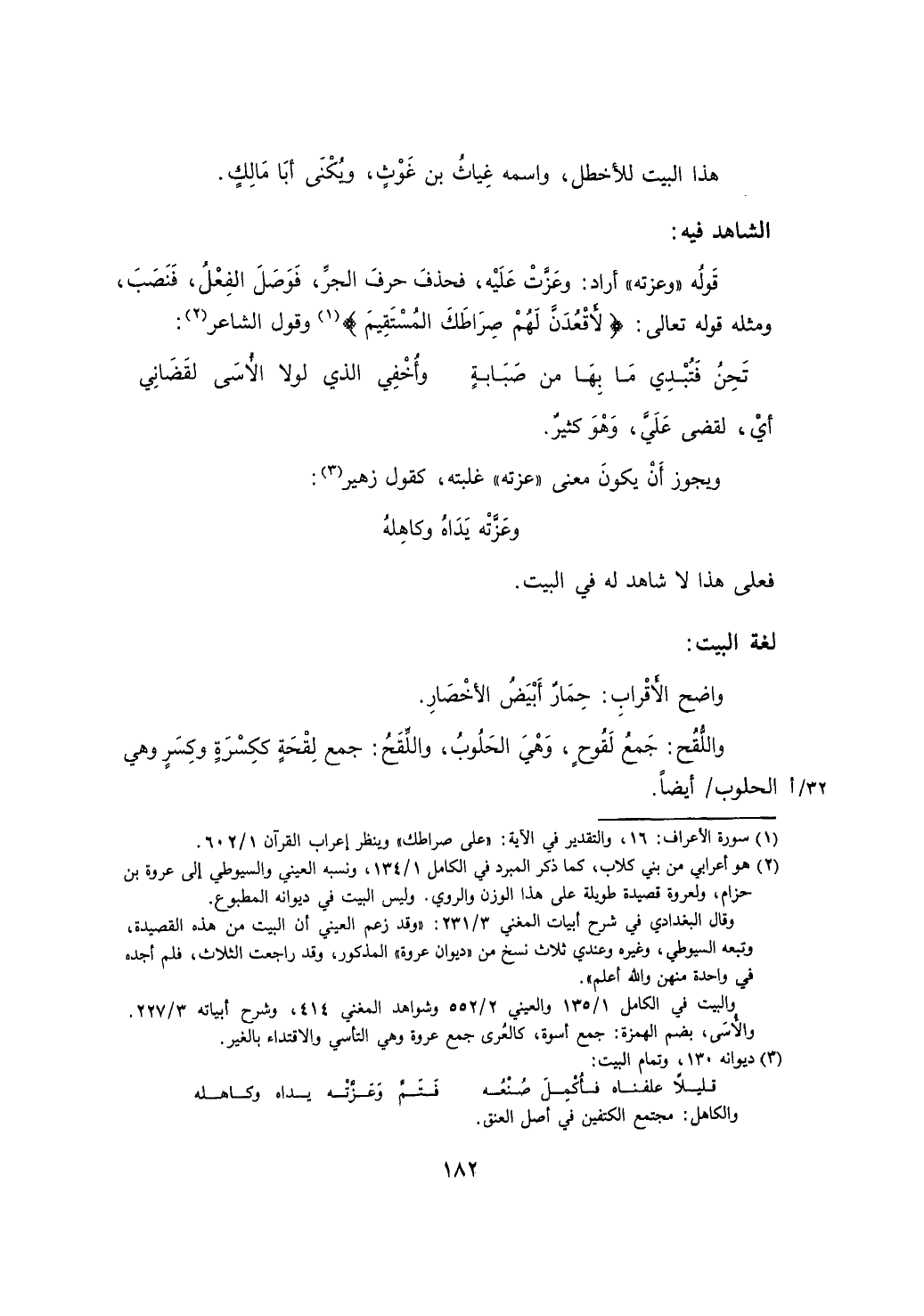 قوله "وعزته" أراد: وعزت عليه، فحذف حرف الجر، فوصل الفعل، فنصب، ومثله قوله تعالى: (لأقعدنَّ لهم صراطك المستقيم) وقول الشاعر: