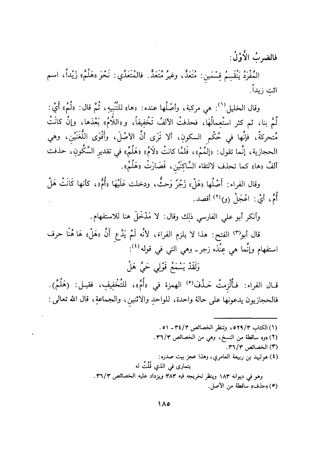 وقال الخليل: هي مركبة، وأصلها عنده: "ها" للتنبيه، ثم قال: "لم" أي: لم بناء، ثم ذكر كثر استعمالها، فحذفت الألف تخفيفاً، و"اللام" بعدها، وإن كانت متحركة، فإنها في حكم السكون، ألا ترى أن الأصل، وأقوى اللغتين، وهي الحجازية، إنما تقول: "إلمم"، فلما كانت "لام" "هلم" في تقدير السكون، حفت ألف "ها" كما تحذف لالتقاء الساكنين، فصارت "هلم".