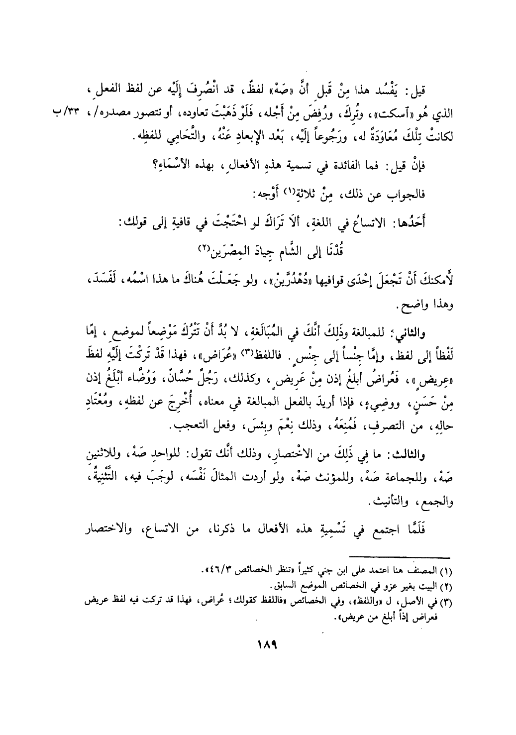 والثاني: للمبالغة وذلك أنك في المبالغة، لا بد أن تترك موضعاً لموضع، إما لفظاً إلى لفظ، وإما جنساً إلى جنس. فاللفظ "عراض"، فهذا قد تركت إليه لفظ "عريض"، فعراض أبلغ إذ من عريض، وكذلك، رجل حسان، ووضاء أبلغ إذن من حسن، ووضئ، فإذا أريد بالفعل المبالغة في معناه، اخرج عن لفظه، ومعتاد حاله، من التصرف، فمنعه، وذلك نعم وبئس، وفعل التعجب.