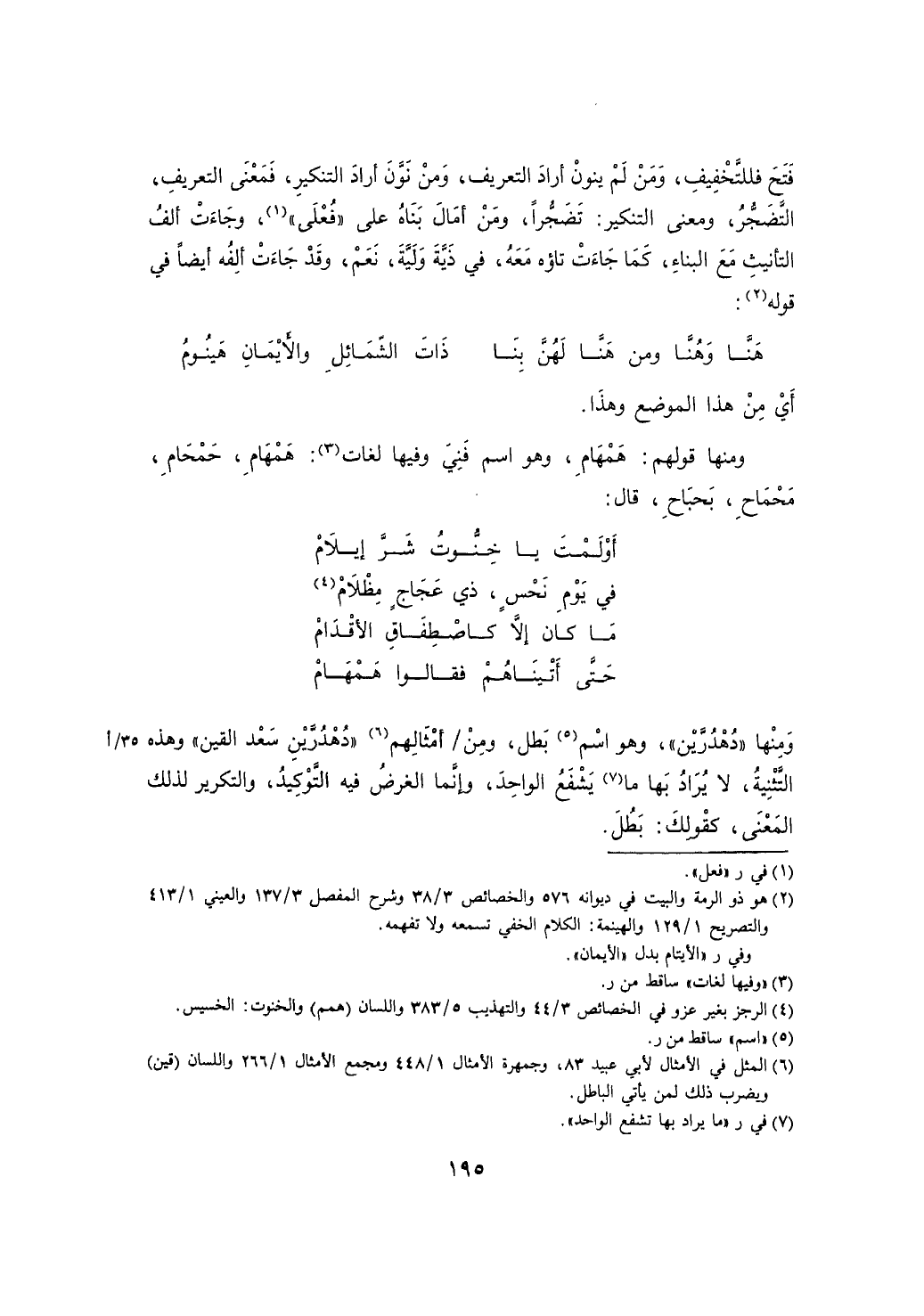 ومنها قولهم: همهام، وهو اسم فني وفيها لغات: همهامِ، حمحام، محماح، بحباح، قال: