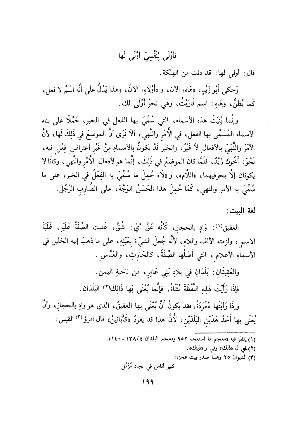 وإذا رأيتها مفردة، فقد يكون أن يعنى بها العقيق، الذي هو واد بالحجاز، وأن يعنى بها أحد هذين البلدين، لأن هذا قد يفرد "كأبانين" قال امرؤ القيس: