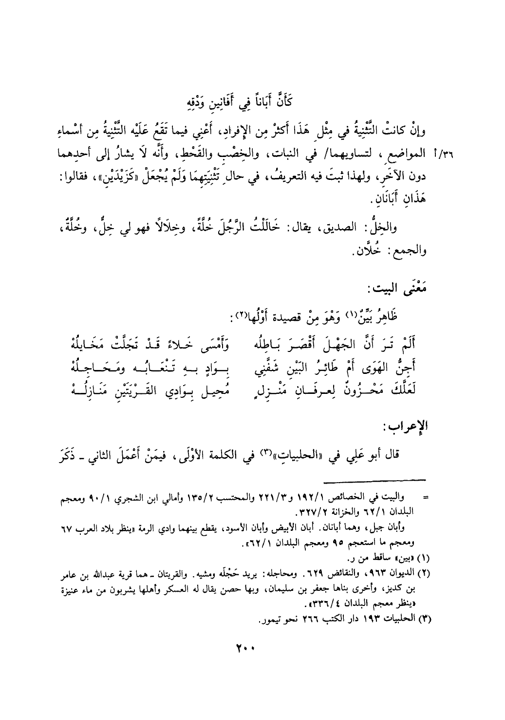 وإن كانت التثنية في مثل هذا أكثر من الإفراد، أعني فيما تقع عليه التثنية من أسماء المواضع، لتساويهما في النبات، والخصب والقحط، وأنه لا يشار إلى أحدهما دون الآخر، ولهذا ثبت فيه التعريف، في حال تثنيتهما ولم يجعل "كزيدين" فقالوا: هذان أبانان.