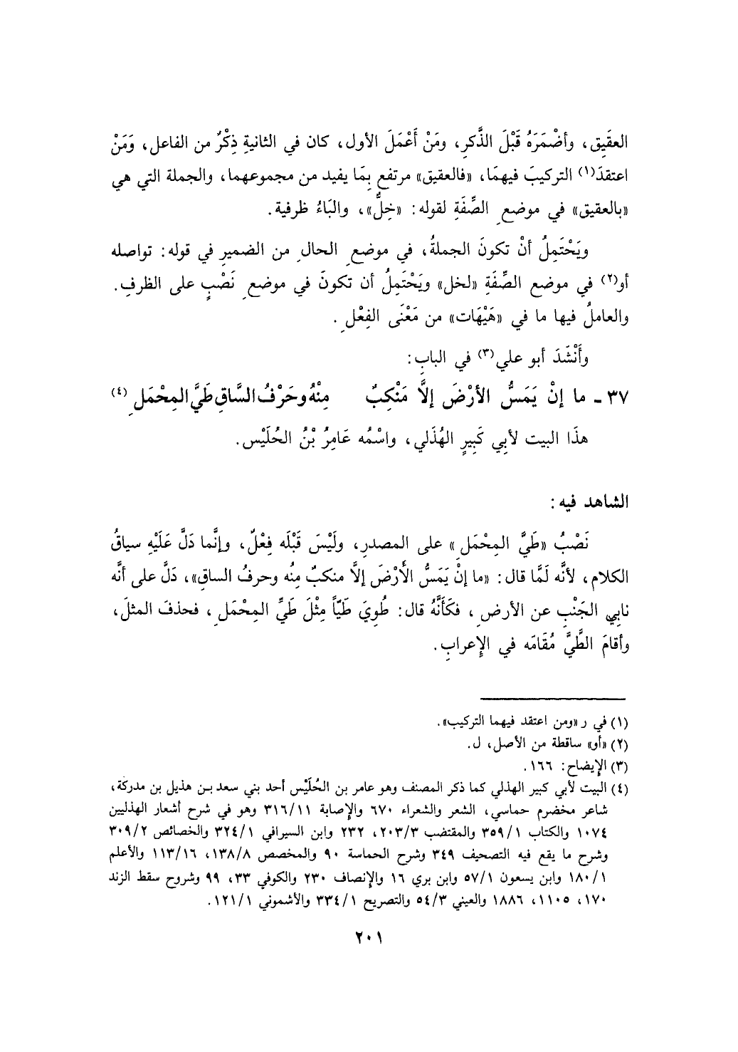 نصب "طي المحمل" على المصدر، وليس قبله فعل، وإنما دل عليه سياق الكلام لأنه لما قال: "ما إن يمس الأرض إلا منكب منه وحرف الساق"، ذل على أنه نابي الجنب عن الأرض، فكأنه قال: طوي طياً مثل طي المحمل، فحذف المثل وأقام الطي مقامه في الإعراب.
