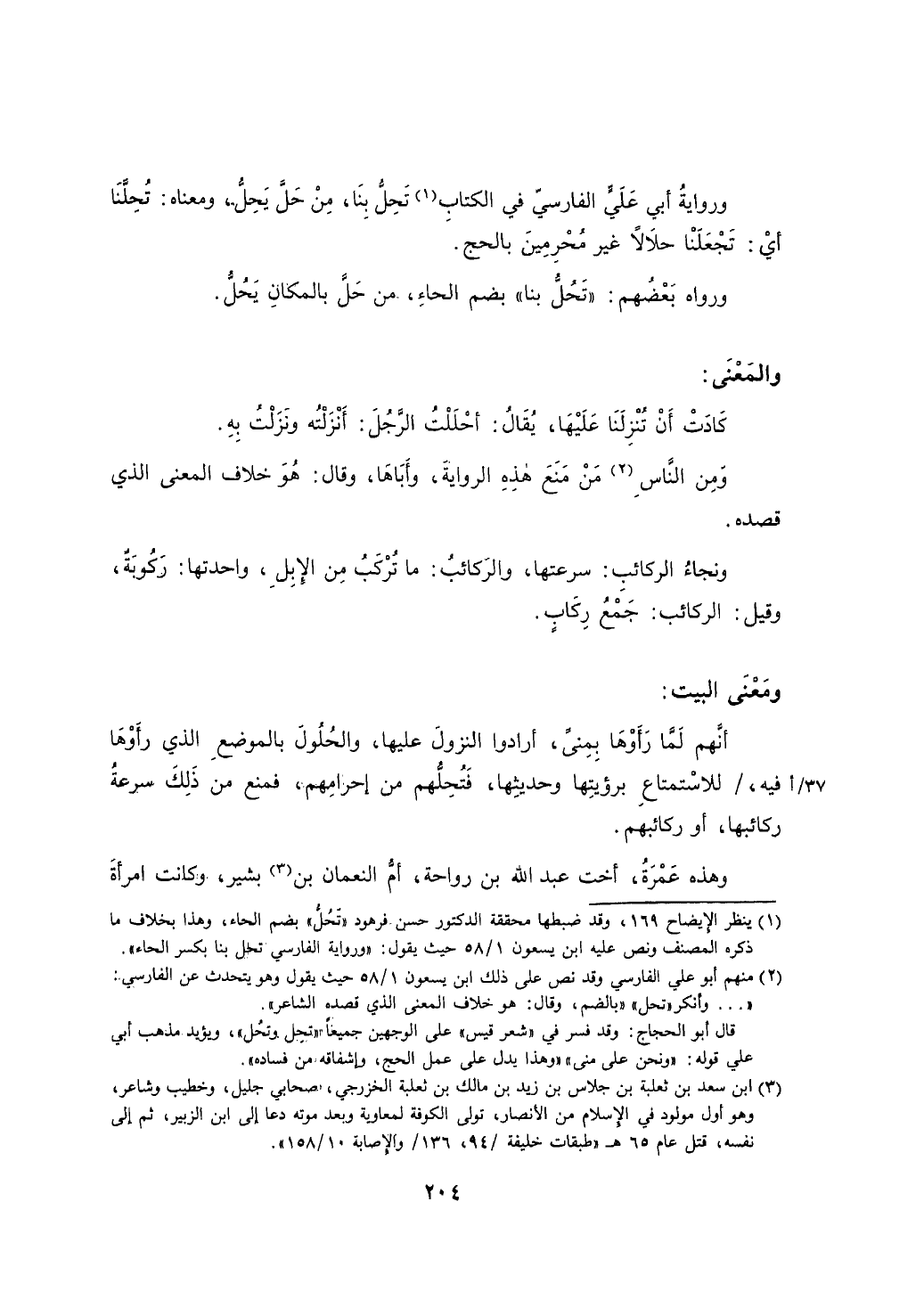 ورواية أبي علي الفارسي في الكتاب تحل بنا، من حل يحل، ومعناه: تحلنا أي: تجعلنا حلالاً غير محرمين بالحج.
