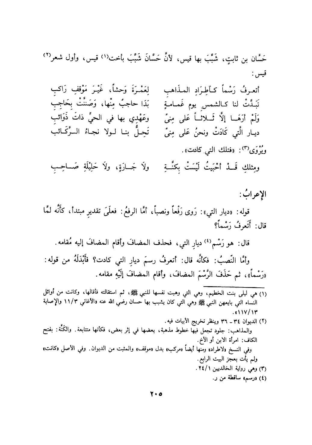 وأما المصب: فكأنه قال: أتعرف رسم ديار التي كادت؟ فأبدله من قوله: "رسماً"، ثم حذف الرسم المضاف، وأقام المضاف إليه مقامه.